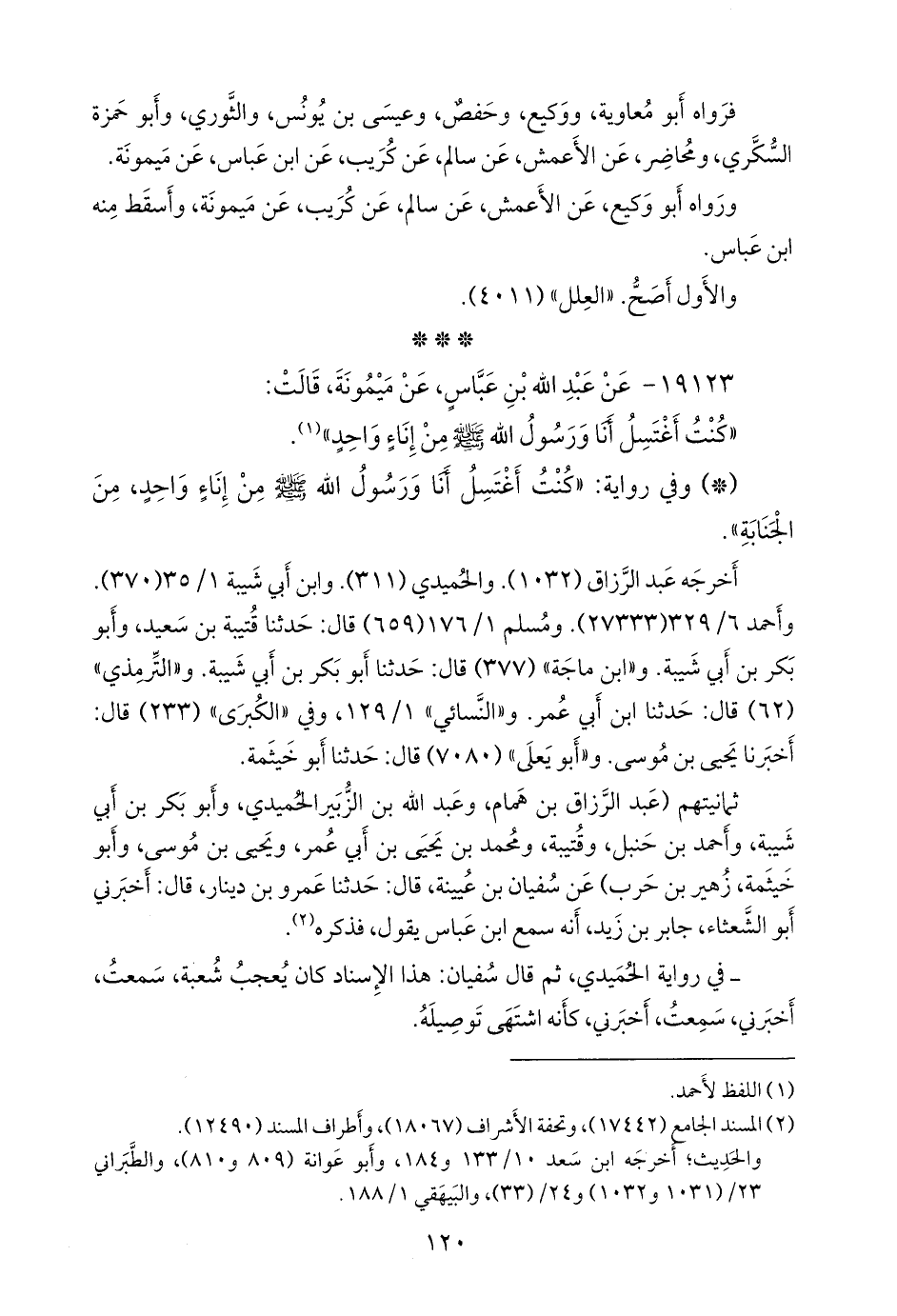 ١٩١٢٢ م- عن عبد الله بن عباس، قال: سأَلت ميمونة خالتي عن غسل النبي صَلى الله عَليه وسَلم من الجنابة؟ قالت: