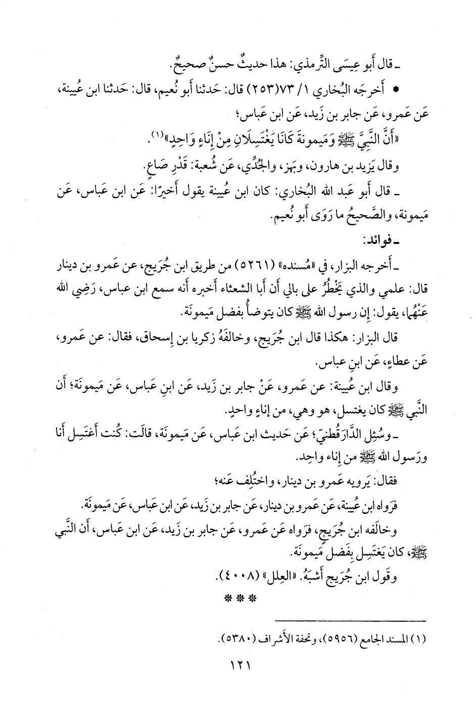 وخالفه ابن جُريج، فرواه عن عَمرو، عن جابر بن زيد، عن ابن عباس، أن النبي صَلى الله عَليه وسَلم كان يغتسل بفضل ميمونة.