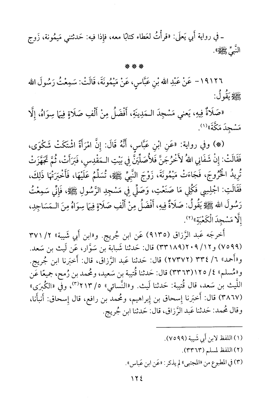 - وفي رواية: «عن ابن عباس، أنه قال: إن امرأة اشتكت شكوى، فقالت: إن شفاني الله لأخرجن فلأصلين في بيت المقدس، فبرأت، ثم تجهزت تريد الخروج، فجاءت ميمونة، زوج النبي صَلى الله عَليه وسَلم تسلم عليها، فأخبرتها ذلك، فقالت: اجلسي فكلي ما صنعت، وصلي في مسجد الرسول صَلى الله عَليه وسَلم فإني سمعت رسول الله صَلى الله عَليه وسَلم يقول: صلاة فيه، أفضل من ألف صلاة فيما سواه من المساجد، إلا مسجد الكعبة» (¬٢).