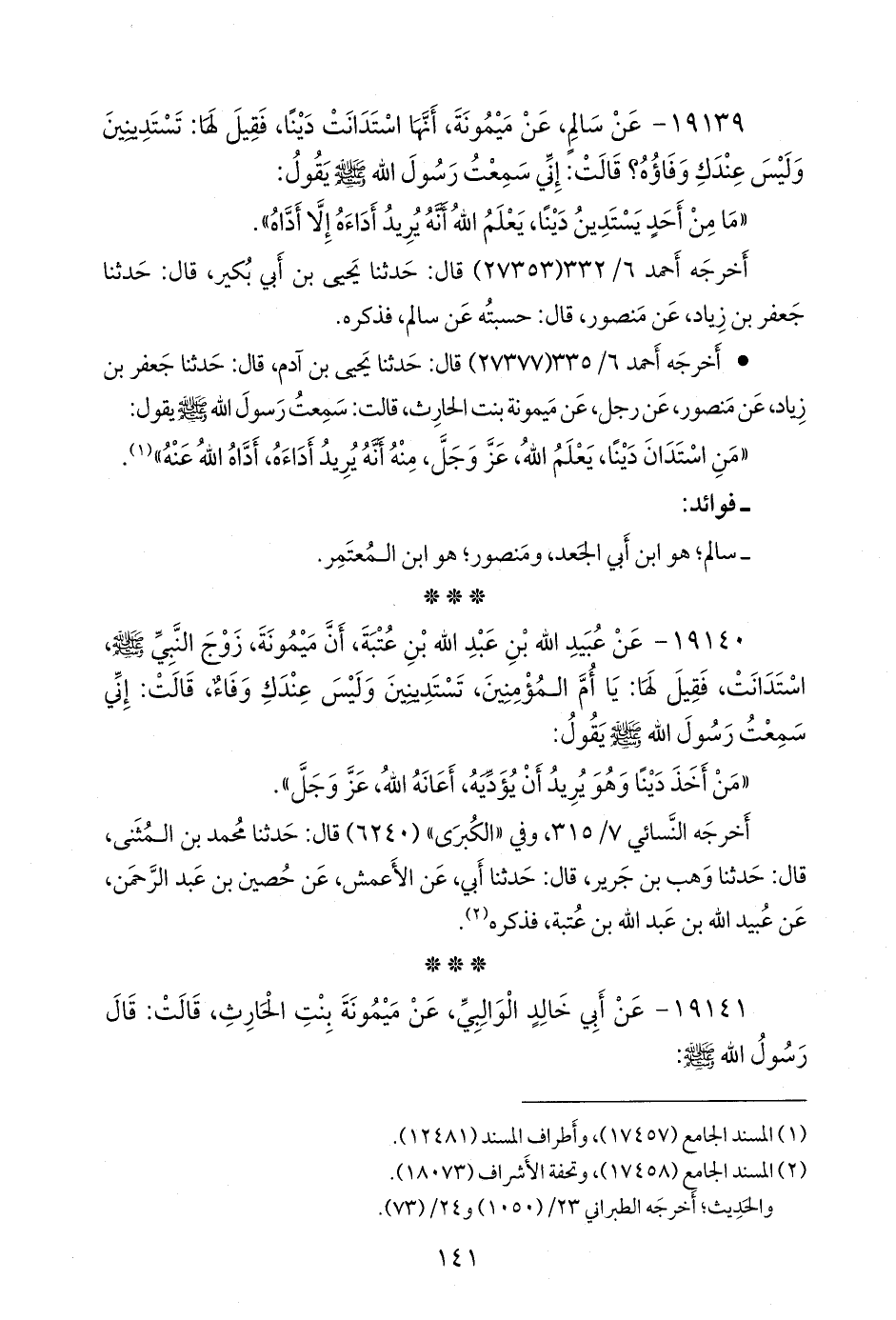 ١٩١٤٠ - عن عُبيد الله بن عبد الله بن عُتبة، أن ميمونة، زوج النبي صَلى الله عَليه وسَلم استدانت، فقيل لها: يا أُم المؤمنين، تستدينين وليس عندك وفاء، قالت: إني سمعت رسول الله صَلى الله عَليه وسَلم يقول: