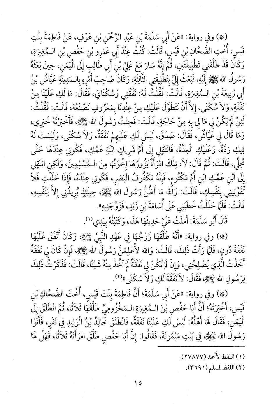 - وفي رواية: «عن أبي سلمة بن عبد الرَّحمَن بن عوف, عن فاطمة بنت قيس، أخت الضحاك بن قيس، قالت: كنت عند أبي عَمرو بن حفص بن المغيرة، وكان قد طلقني تطليقتين، ثم إنه سار مع علي بن أبي طالب إلى اليمن، حين بعثه رسول الله صَلى الله عَليه وسَلم إليه، فبعث إلي بتطليقتي الثالثة، وكان صاحب أمره بالمدينة عياش بن أبي ربيعة بن المغيرة، قالت: فقلت له: نفقتي وسكناي، فقال: ما لك علينا من نفقة، ولا سكنى، إلا أن نتطول عليك من عندنا بمعروف نصنعه، قالت: فقلت: لئن لم يكن لي ما لي به من حاجة، قالت: فجئت رسول الله صَلى الله عَليه وسَلم فأخبرته خبري، وما قال لي عياش، فقال: صدق، ليس لك عليهم نفقة، ولا سكنى، وليست له فيك ردة، وعليك العدة، فانتقلي إلى أم شريك ابنة عمك، فكوني عندها حتى تحلي، قالت: ثم قال: لا، تلك امرأة يزورها إخوتها من المسلمين، ولكن انتقلي إلى ابن عمك ابن أم مكتوم، فإنه مكفوف البصر، فكوني عنده، فإذا حللت فلا تفوتيني بنفسك، قالت: والله ما أظن رسول الله صَلى الله عَليه وسَلم حينئذ يريدني إلا لنفسه، قالت: فلما حللت خطبني على أسامة بن زيد، فزوجنيه».