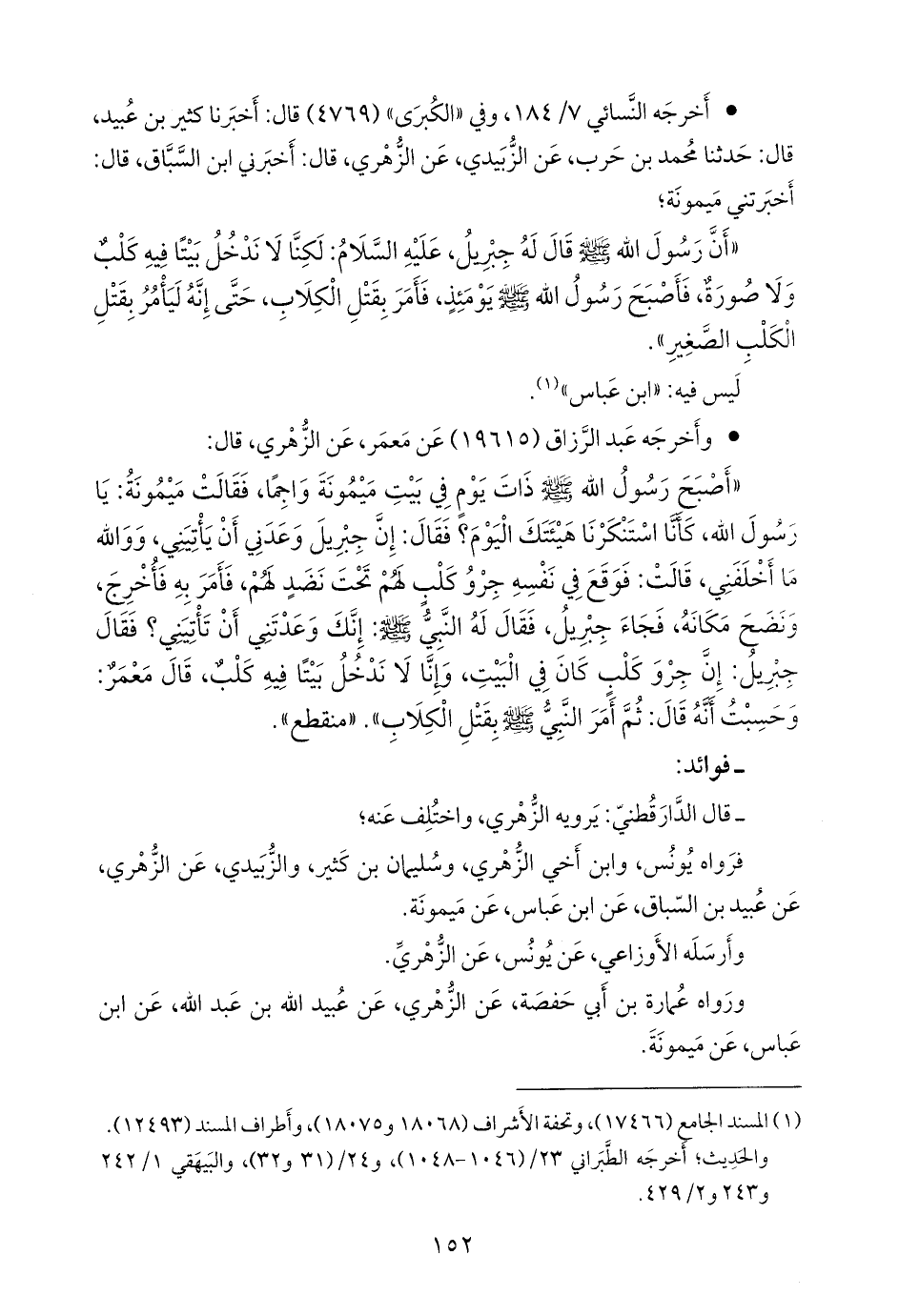 «أصبح رسول الله صَلى الله عَليه وسَلم ذات يوم في بيت ميمونة واجما، فقالت ميمونة: يا رسول الله، كأنا استنكرنا هيئتك اليوم؟ فقال: إن جبريل وعدني أن يأتيني، ووالله ما أخلفني، قالت: فوقع في نفسه جرو كلب لهم تحت نضد لهم، فأمر به فأخرج، ونضح مكانه، فجاء جبريل، فقال له النبي صَلى الله عَليه وسَلم: إنك وعدتني أن تأتيني؟ فقال جبريل: إن جرو كلب كان في البيت، وإنا لا ندخل بيتا فيه كلب، قال معمر: وحَسِبتُ أنه قال: ثم أمر النبي صَلى الله عَليه وسَلم بقتل الكلاب»، «منقطع».