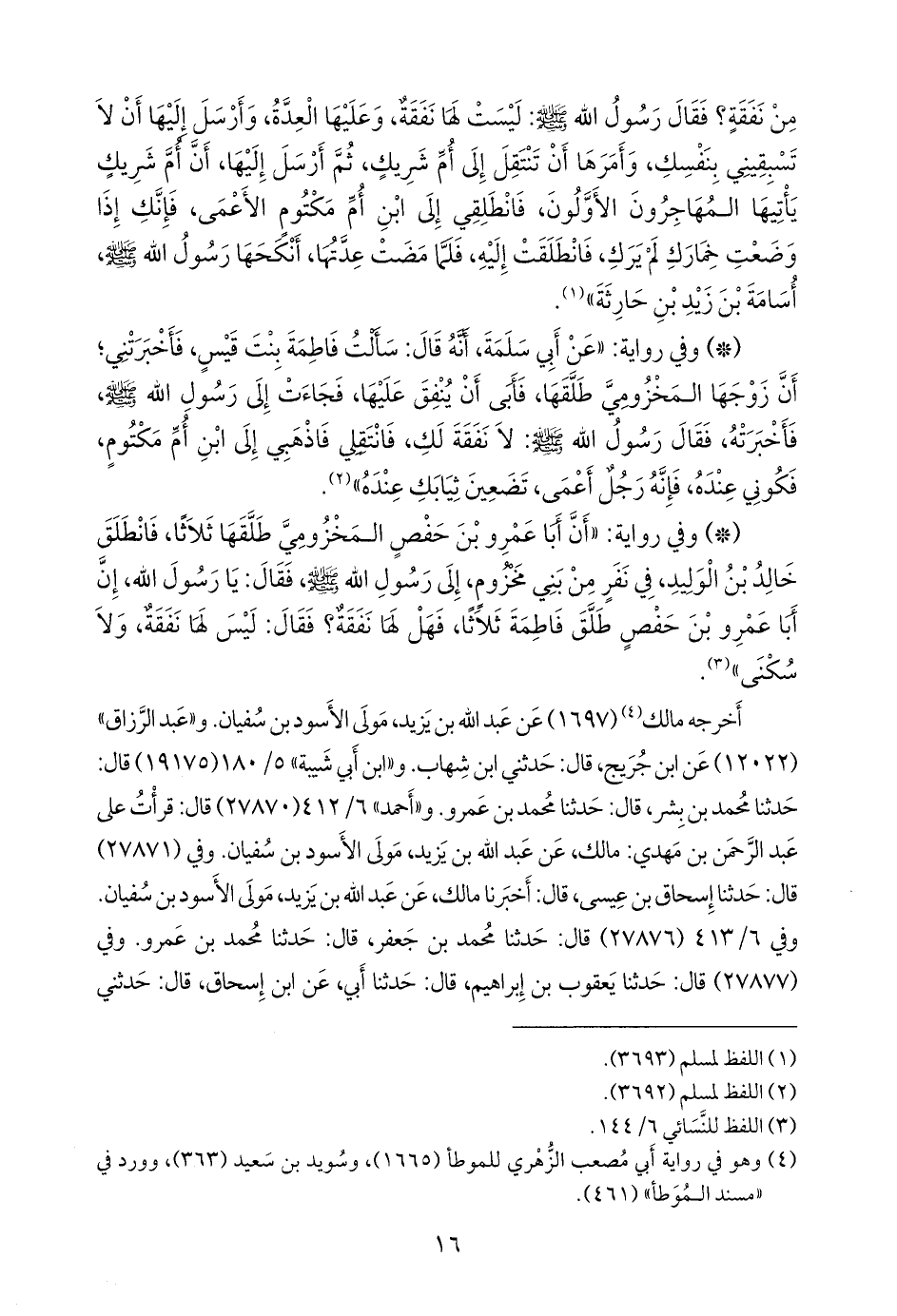 - وفي رواية: «أن أبا عَمرو بن حفص المخزومي طلقها ثلاثا، فانطلق خالد بن الوليد، في نفر من بني مخزوم، إلى رسول الله صَلى الله عَليه وسَلم فقال: يا رسول الله، إن أبا عَمرو بن حفص طلق فاطمة ثلاثا، فهل لها نفقة؟ فقال: ليس لها نفقة، ولا سكنى» (¬٣).