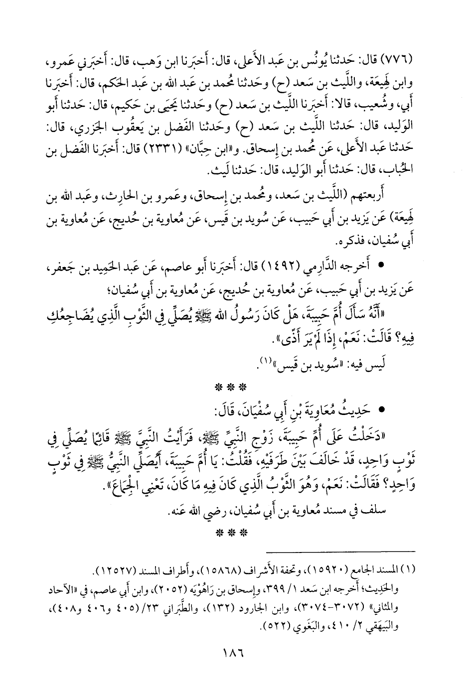 «دخلت على أم حبيبة، زوج النبي صَلى الله عَليه وسَلم فرأيت النبي صَلى الله عَليه وسَلم قائمًا يصلي في ثوب واحد، قد خالف بين طرفيه، فقلت: يا أُم حبيبة، أيصلي النبي صَلى الله عَليه وسَلم في ثوب واحد؟ فقالت: نعم، وهو الثوب الذي كان فيه ما كان، تعني الجماع».