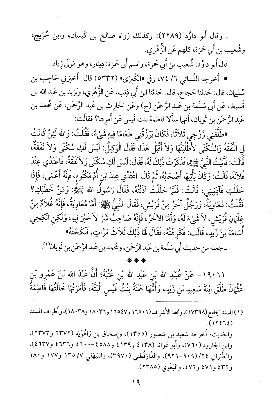 ١٩٠٦١ - عن عُبيد الله بن عبد الله بن عُتبة؛ أن عبد الله بن عَمرو بن عثمان طلق ابنة سعيد بن زيد، وأمها حمنة بنت قيس البتة، فأمرتها خالتها فاطمة