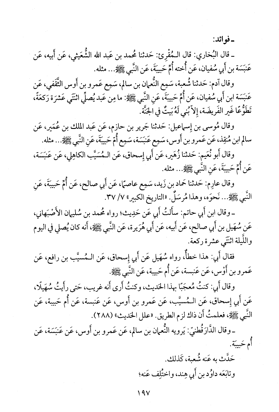 - وقال الدارقُطني: يرويه النعمان بن سالم، عن عَمرو بن أوس، عن عنبسة، عن أم حبيبة.