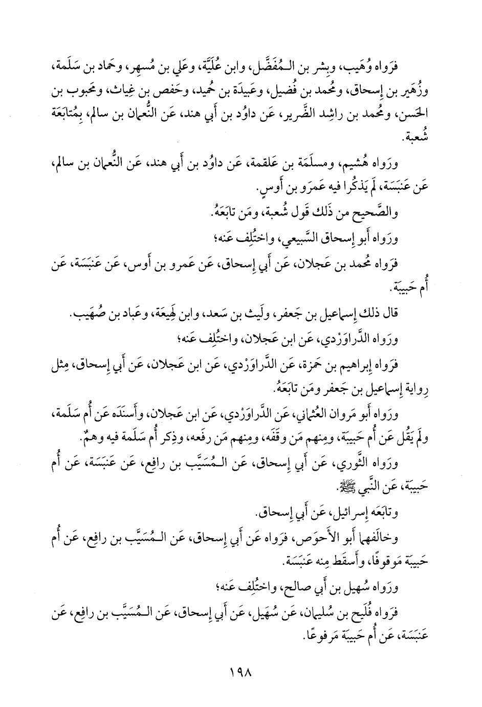 وخالفهما أَبو الأحوص، فرواه عن أبي إسحاق، عن المُسَيب بن رافع، عن أم حبيبة، موقوفا، وأسقط منه عنبسة.
