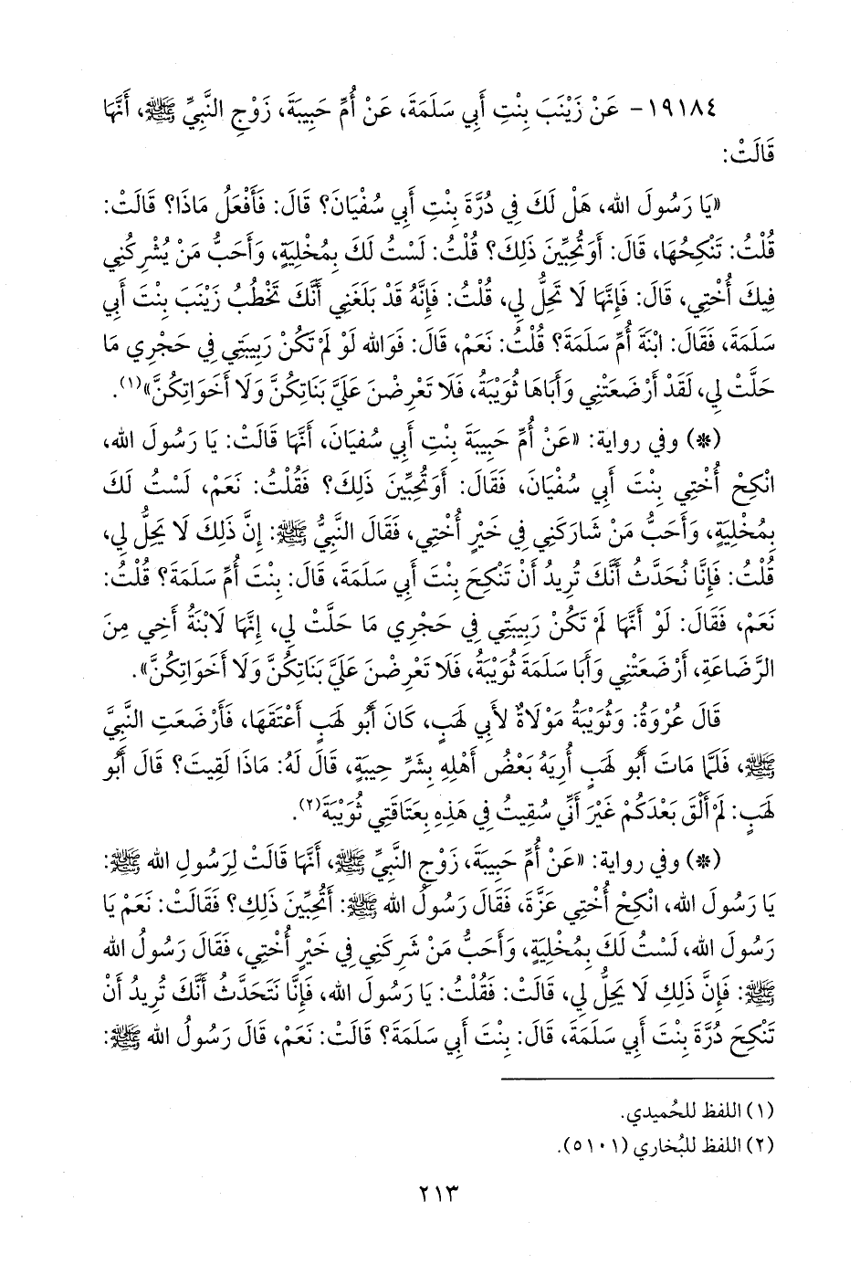 - وفي رواية: «عن أم حبيبة بنت أبي سفيان، أنها قالت: يا رسول الله، انكح أختي بنت أبي سفيان، فقال: أوتحبين ذلك؟ فقلت: نعم، لست لك بمخلية، وأحب من شاركني في خير أختي، فقال النبي صَلى الله عَليه وسَلم: إن ذلك لا يحل لي، قلت: فإنا نحدث أنك تريد أن تنكح بنت أبي سلمة، قال: بنت أُم سلمة؟ قلت: نعم، فقال: لو أنها لم تكن ربيبتي في حجري ما حلت لي، إنها لابنة أخي من الرضاعة، أرضعتني وأبا سلمة ثويبة، فلا تعرضن علي بناتكن ولا أخواتكن».