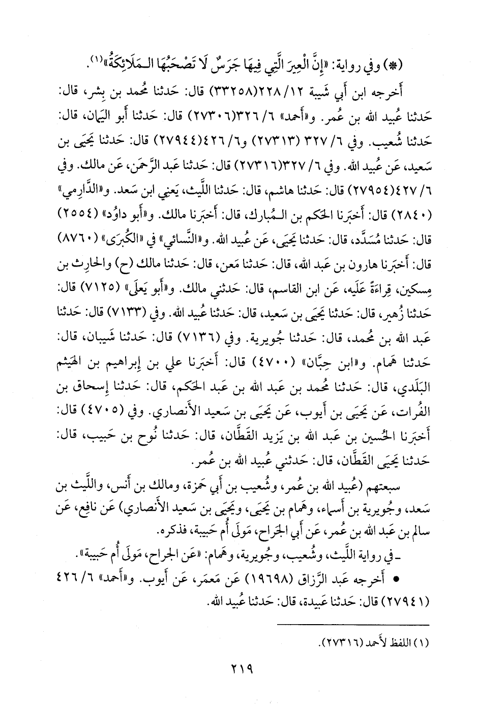 و «أَبو يَعلى» (٧١٢٥) قال: حدثنا زهير، قال: حدثنا يحيى بن سعيد، قال: حدثنا عُبيد الله. وفي (٧١٣٣) قال: حدثنا عبد الله بن محمد، قال: حدثنا جويرية. وفي (٧١٣٦) قال: حدثنا شَيبان، قال: حدثنا همام. و «ابن حِبَّان» (٤٧٠٠) قال: أخبرنا علي بن إبراهيم بن الهيثم البلدي، قال: حدثنا محمد بن عبد الله بن عبد الحكم، قال: حدثنا إسحاق بن الفرات، عن يحيى بن أيوب، عن يحيى بن سعيد الأَنصاري. وفي (٤٧٠٥) قال: أخبرنا الحسين بن عبد الله بن يزيد القطان، قال: حدثنا نوح بن حبيب، قال: حدثنا يحيى القطان، قال: حدثني عُبيد الله بن عمر.
