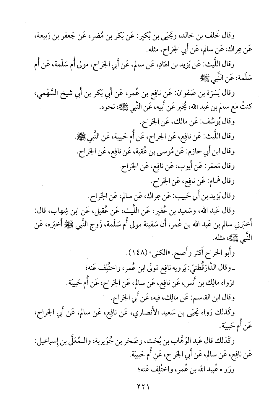 وكذلك قال عبد الوَهَّاب بن بُخْت، وصخر بن جويرية، والمعلى بن إسماعيل: عن نافع، عن سالم، عن أبي الجراح، عن أم حبيبة.