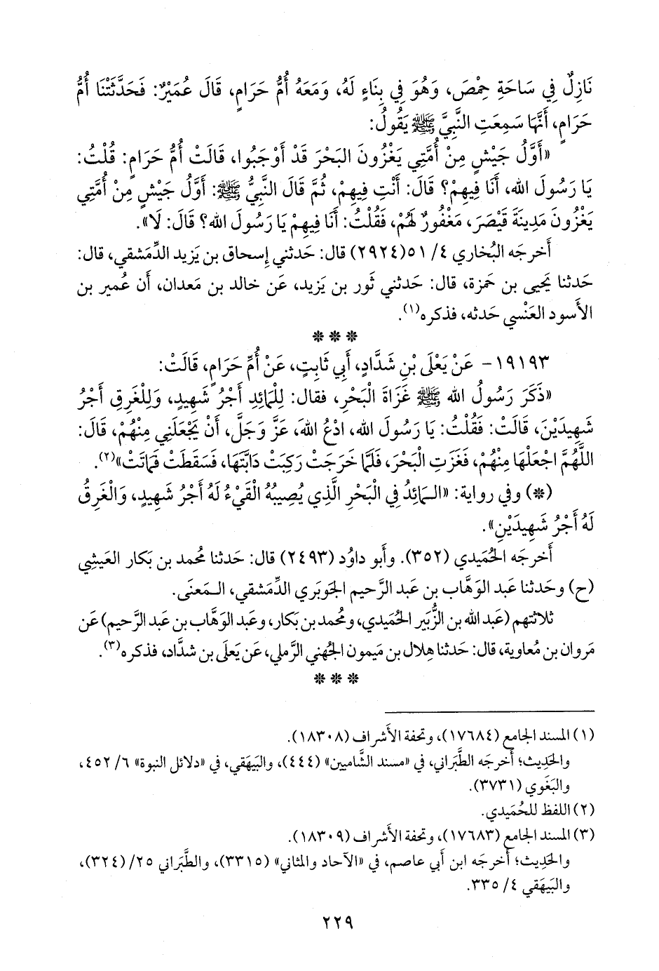 «ذكر رسول الله صَلى الله عَليه وسَلم غزاة البحر، فقال: للمائد أجر شهيد، وللغرق أجر شهيدين، قالت: فقلت: يا رسول الله، ادع الله، عز وجل، أن يجعلني منهم، قال: اللهم اجعلها منهم.