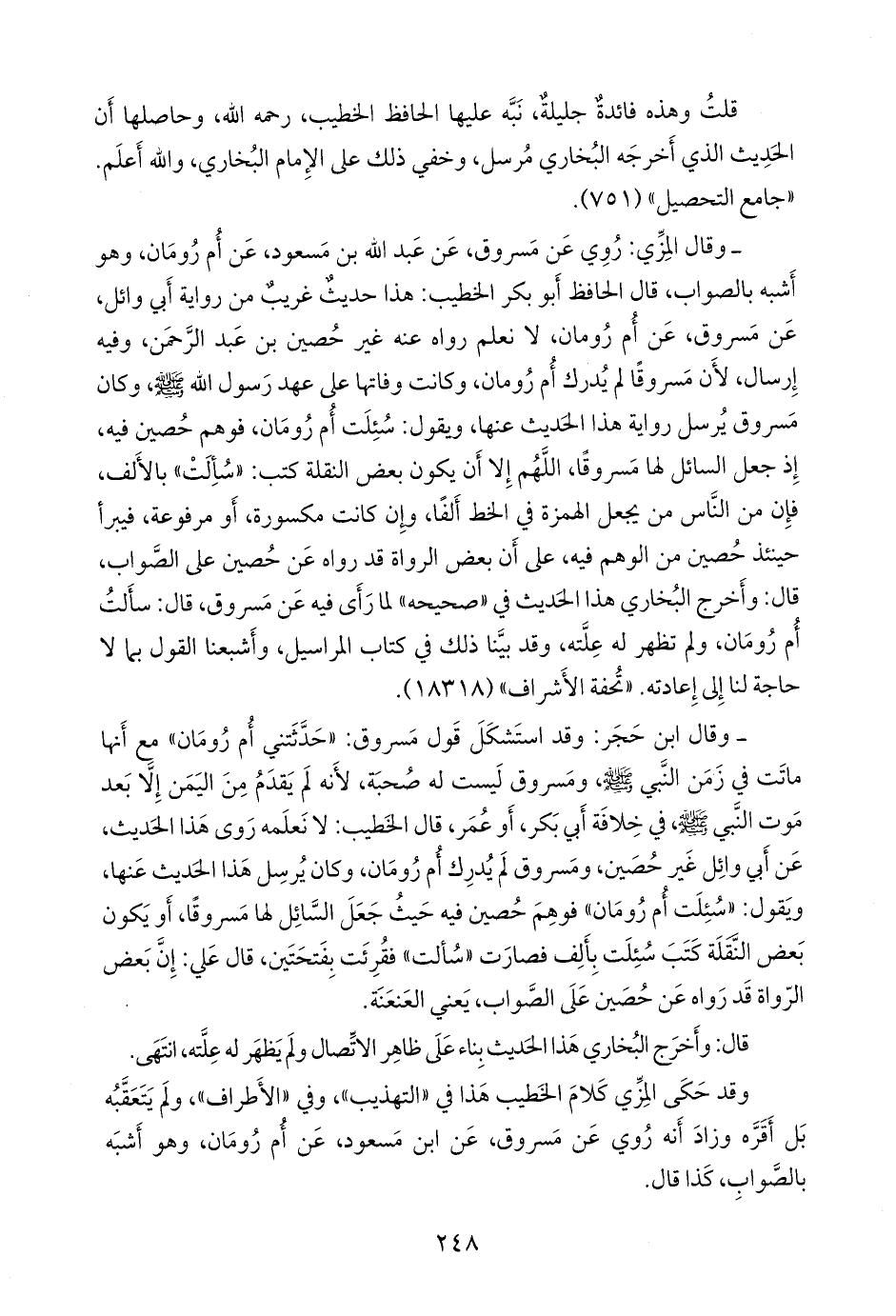 ـ وعقب ابن حجر، فقال: حكى المِزِّي كلام الخطيب هذا في «التهذيب»، وفي «الأطراف»، ولم يتعقبه بل أقره وزاد أنه روي عن مسروق، عن ابن مسعود، عن أم رومان، وهو أشبه بالصواب، كذا قال.