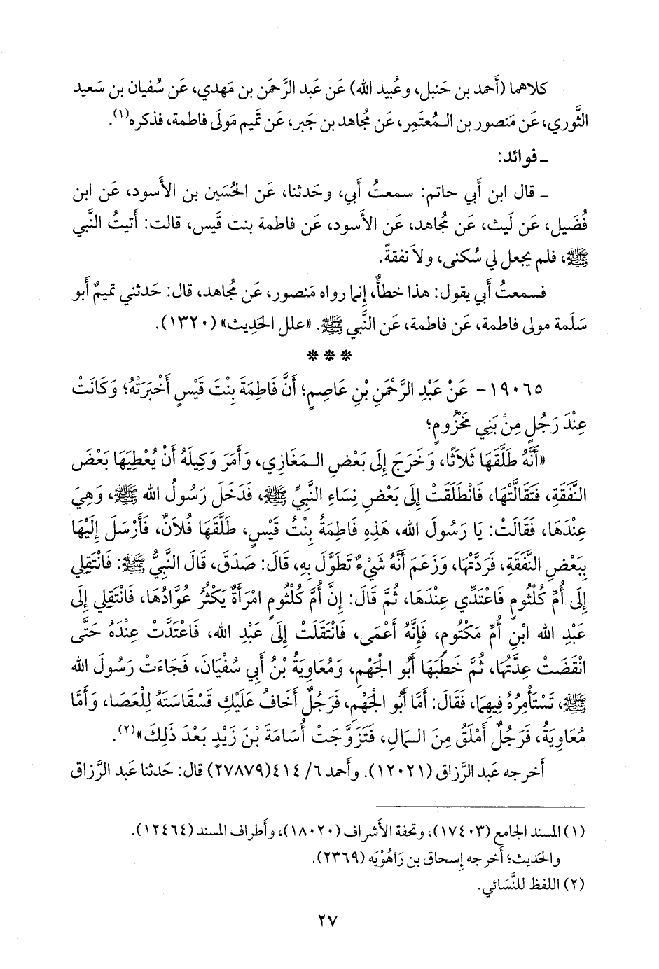 - قال عبد الرَّحمَن بن أبي حاتم الرازي: سمعت أبي، وحدثنا، عن الحسين بن الأسود، عن ابن فضيل، عن ليث، عن مجاهد، عن الأسود، عن فاطمة بنت قيس، قالت: أتيت النبي صَلى الله عَليه وسَلم فلم يجعل لي سكنى، ولا نفقة.