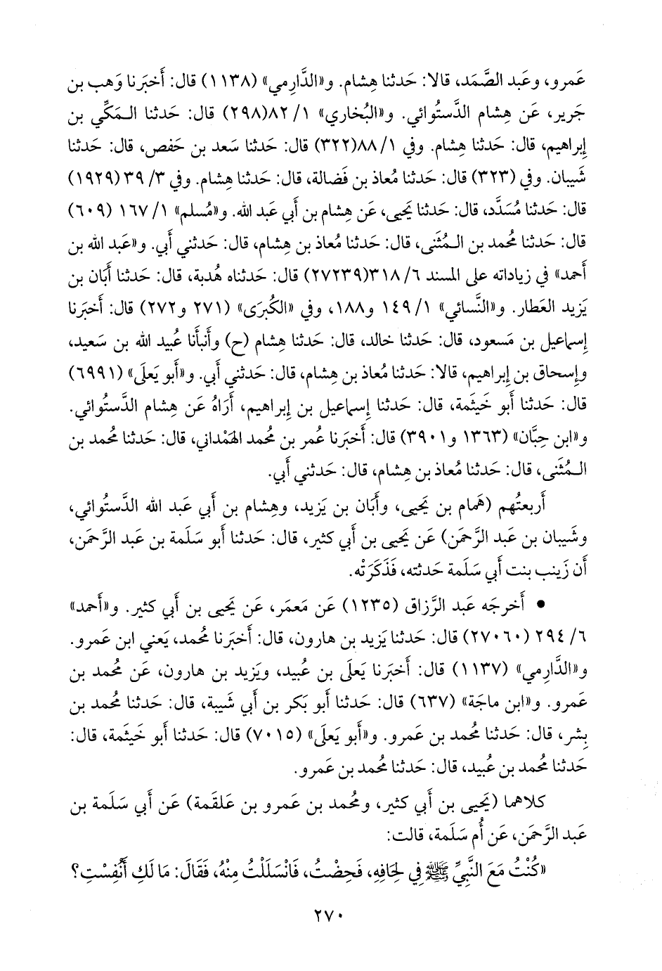 • أخرجه عبد الرزاق (١٢٣٥) عن مَعمَر، عن يحيى بن أبي كثير. و «أحمد» ٦/ ٢٩٤ (٢٧٠٦٠) قال: حدثنا يزيد بن هارون، قال: أخبرنا محمد، يعني ابن عَمرو. و «الدَّارِمي» (١١٣٧) قال: أخبرنا يَعلى بن عبيد، ويزيد بن هارون, عن محمد بن عَمرو. و «ابن ماجة» (٦٣٧) قال: حدثنا أَبو بكر بن أبي شيبة، قال: حدثنا محمد بن بشر، قال: حدثنا محمد بن عَمرو. و «أَبو يَعلى» (٧٠١٥) قال: حدثنا أَبو خيثمة، قال: حدثنا محمد بن عبيد، قال: حدثنا محمد بن عَمرو.