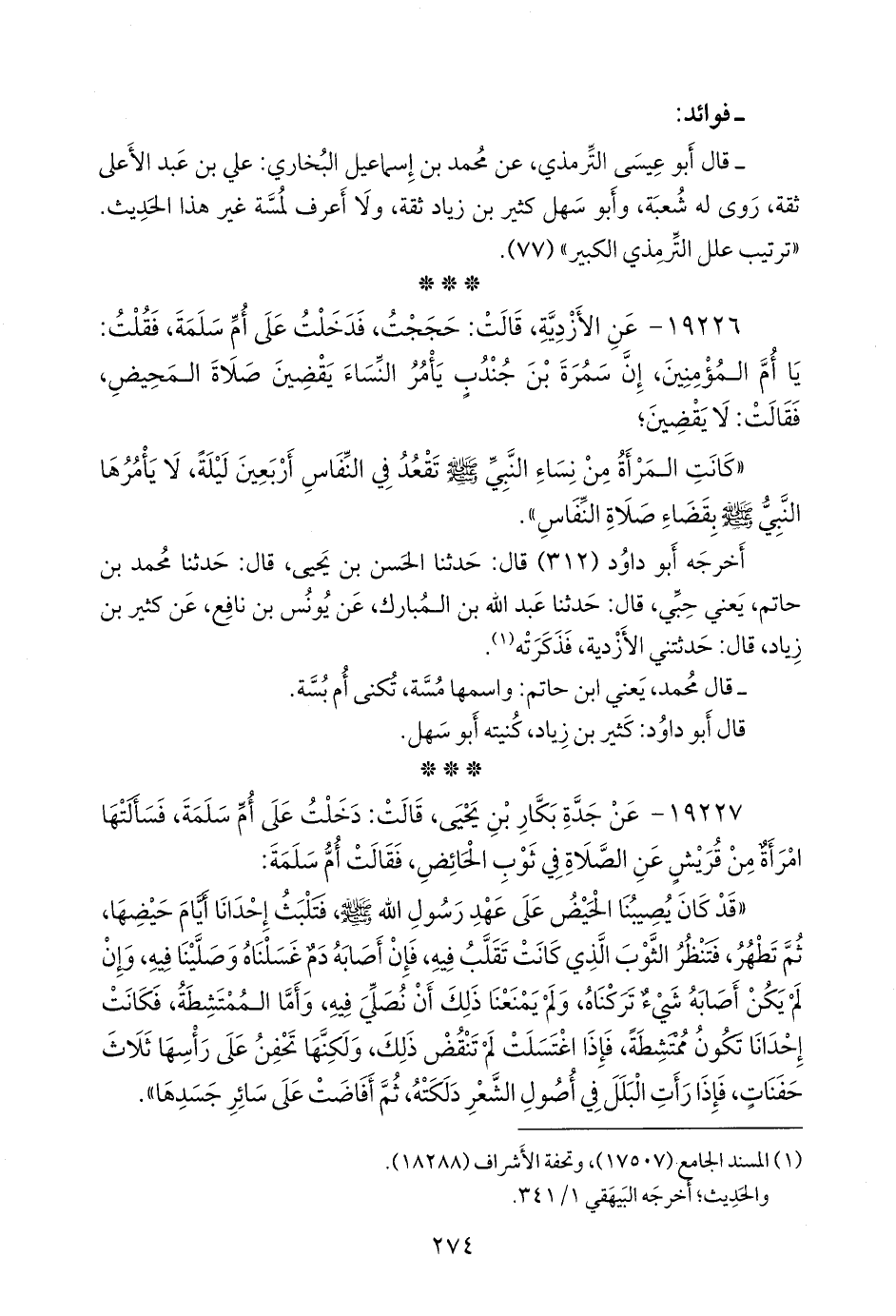 ١٩٢٢٦ - عن الأزدية، قالت: حججت، فدخلت على أُم سلمة، فقلت: يا أُم المؤمنين، إن سَمُرة بن جُندب يأمر النساء يقضين صلاة المحيض، فقالت: لا يقضين؛