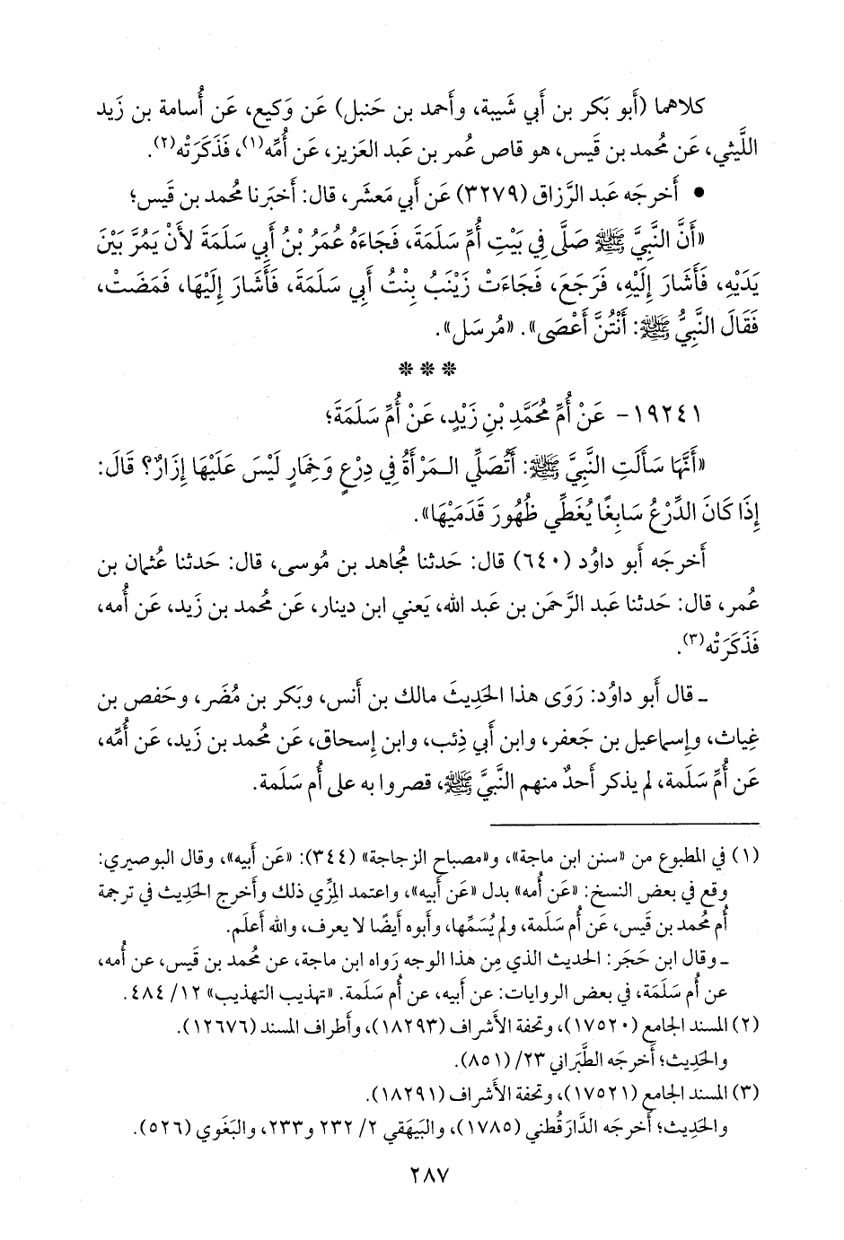 - قال أَبو داود: روى هذا الحديث مالك بن أنس، وبكر بن مضر، وحفص بن غياث، وإسماعيل بن جعفر، وابن أبي ذِئب، وابن إسحاق، عن محمد بن زيد، عن أمه، عن أُم سلمة، لم يذكر أحد منهم النبي صَلى الله عَليه وسَلم قصروا به على أُم سلمة.