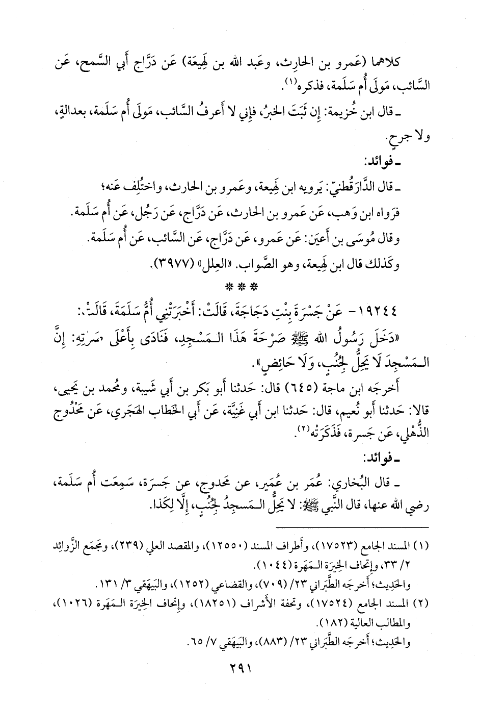 - قال البخاري: عمر بن عمير، عن محدوج، عن جَسْرة، سمعت أُم سلمة، رضي الله عنها، قال النبي صَلى الله عَليه وسَلم: لا يحل المسجد لجنب، إلا لكذا.