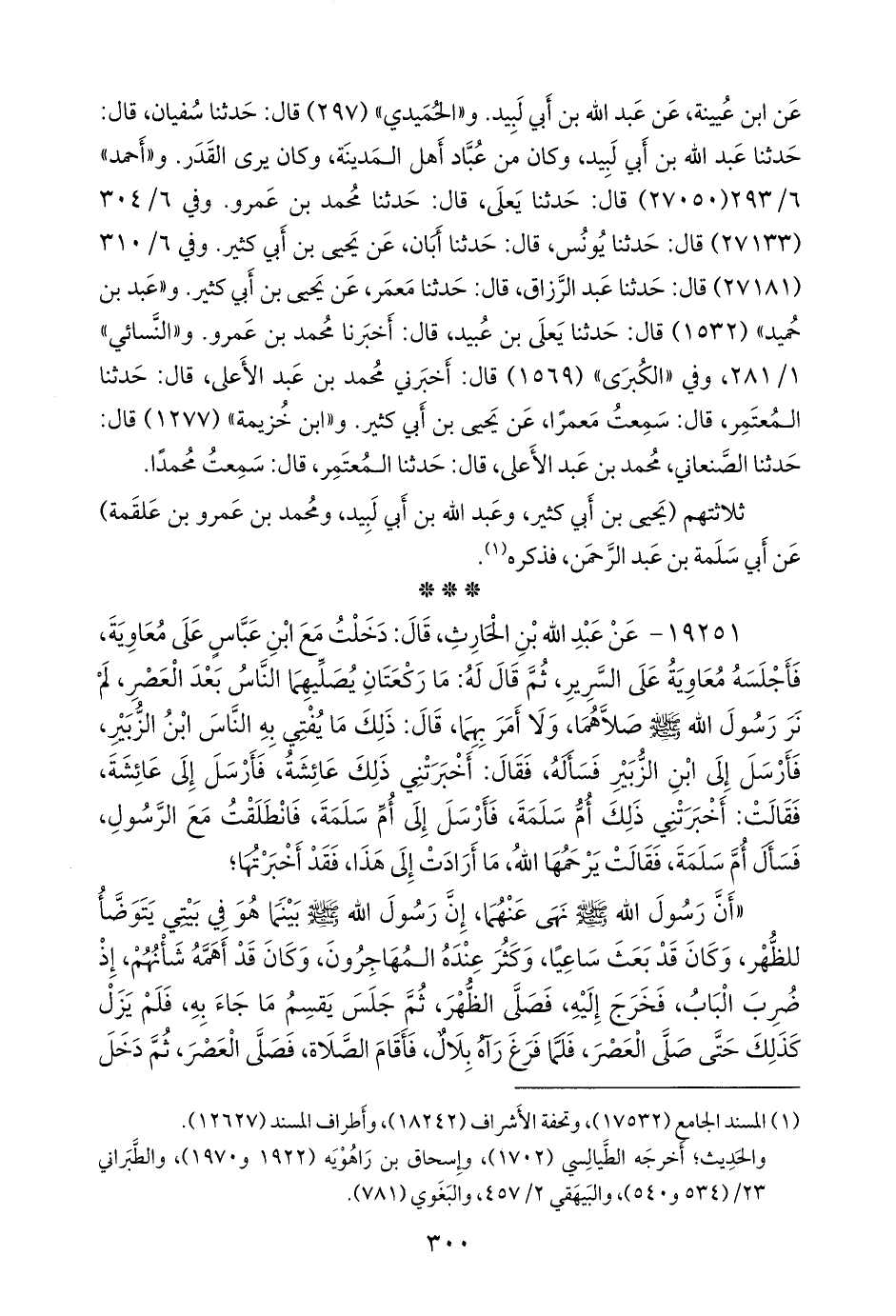 ١٩٢٥١ - عن عبد الله بن الحارث، قال: دخلت مع ابن عباس على معاوية، فأجلسه معاوية على السرير، ثم قال له: ما ركعتان يصليهما الناس بعد العصر، لم نر رسول الله صَلى الله عَليه وسَلم صلاهما، ولا أمر بهما، قال: ذلك ما يفتي به الناس ابن الزبير، فأرسل إلى ابن الزبير فسأله، فقال: أخبرتني ذلك عائشة، فأرسل إلى عائشة، فقالت: أخبرتني ذلك أُم سلمة، فأرسل إلى أُم سلمة، فانطلقت مع الرسول، فسأل أُم سلمة، فقالت: يرحمها الله، ما أرادت إلى هذا، فقد أخبرتها؛