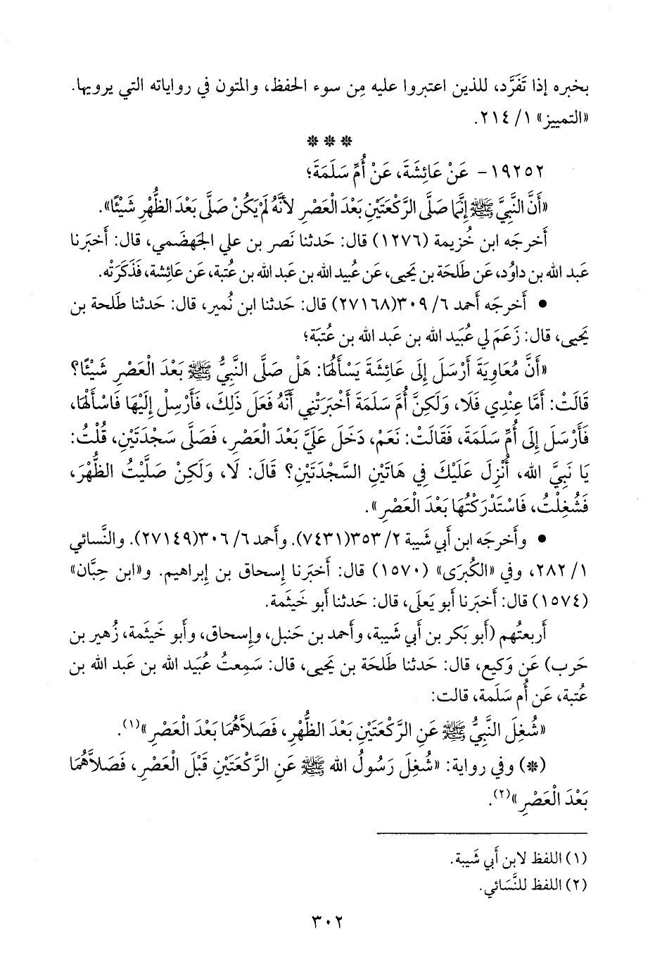 «أن معاوية أرسل إلى عائشة يسألها: هل صلى النبي صَلى الله عَليه وسَلم بعد العصر شيئا؟ قالت: أما عندي فلا، ولكن أُم سلمة أخبرتني أنه فعل ذلك، فأرسل إليها فاسألها، فأرسل إلى أُم سلمة، فقالت: نعم، دخل علي بعد العصر، فصلى سجدتين، قلت: يا نبي الله، أنزل عليك في هاتين السجدتين؟ قال: لا، ولكن صليت الظهر، فشغلت، فاستدركتها بعد العصر».