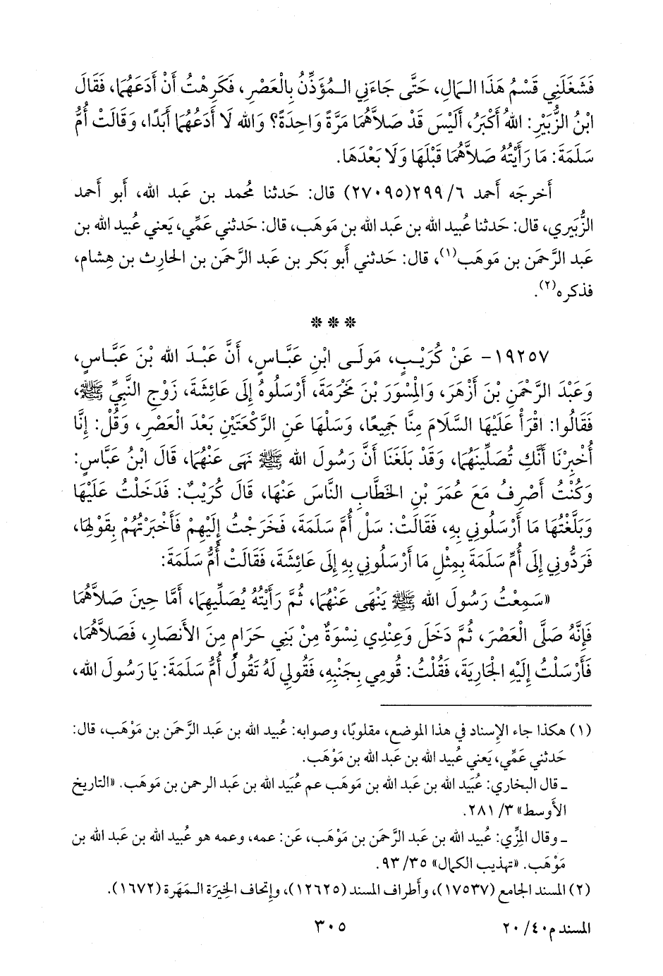١٩٢٥٧ - عن كُريب مولى ابن عباس، أن عبد الله بن عباس، وعبد الرَّحمَن بن أزهر، والمسور بن مخرمة، أرسلوه إلى عائشة، زوج النبي صَلى الله عَليه وسَلم فقالوا: اقرأ عليها السلام منا جميعا، وسلها عن الركعتين بعد العصر، وقل: إنا أخبرنا أنك تصلينهما، وقد بلغنا أن رسول الله صَلى الله عَليه وسَلم نهى عنهما، قال ابن عباس: وكنت أصرف مع عمر بن الخطاب الناس عنها، قال كُريب: فدخلت عليها وبلغتها ما أرسلوني به، فقالت: سل أُم سلمة، فخرجت إليهم فأخبرتهم بقولها، فردوني إلى أُم سلمة بمثل ما أرسلوني به إلى عائشة، فقالت أُم سلمة:
