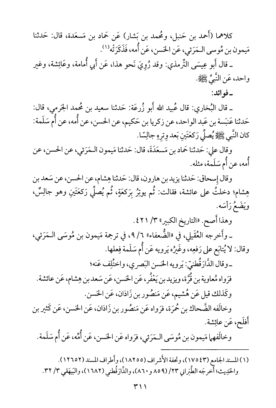 - قال البخاري: قال عُبيد الله أَبو زُرعَة: حدثنا سعيد بن محمد الجَرْمي، قال: حدثنا عنبسة بن عبد الواحد، عن زكريا بن حكيم، عن الحسن، عن أمه، عن أُم سلمة: كان النبي صَلى الله عَليه وسَلم يصلي ركعتين بعد وتره جالسا.