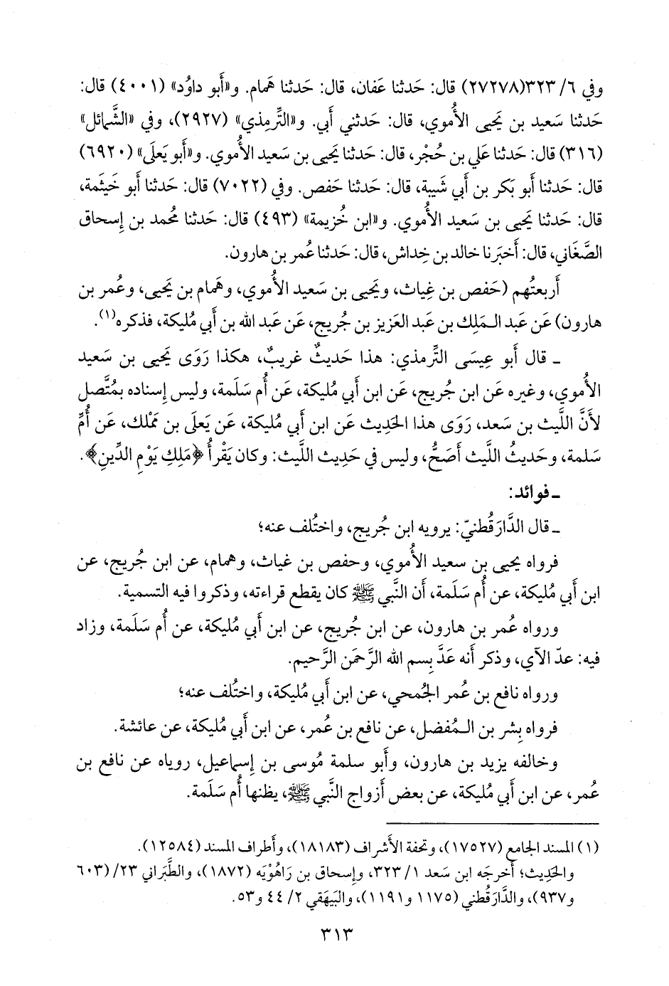 فرواه يحيى بن سعيد الأُمَوي، وحفص بن غياث، وهمام، عن ابن جُريج، عن ابن أَبي مُليكة، عن أُم سلمة، أن النبي صَلى الله عَليه وسَلم كان يقطع قراءته، وذكروا فيه التسمية.