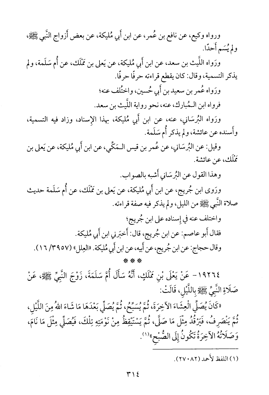 ١٩٢٦٤ - عن يَعلى بن مملك، أنه سأل أُم سلمة، زوج النبي صَلى الله عَليه وسَلم عن صلاة النبي صَلى الله عَليه وسَلم بالليل، قالت: