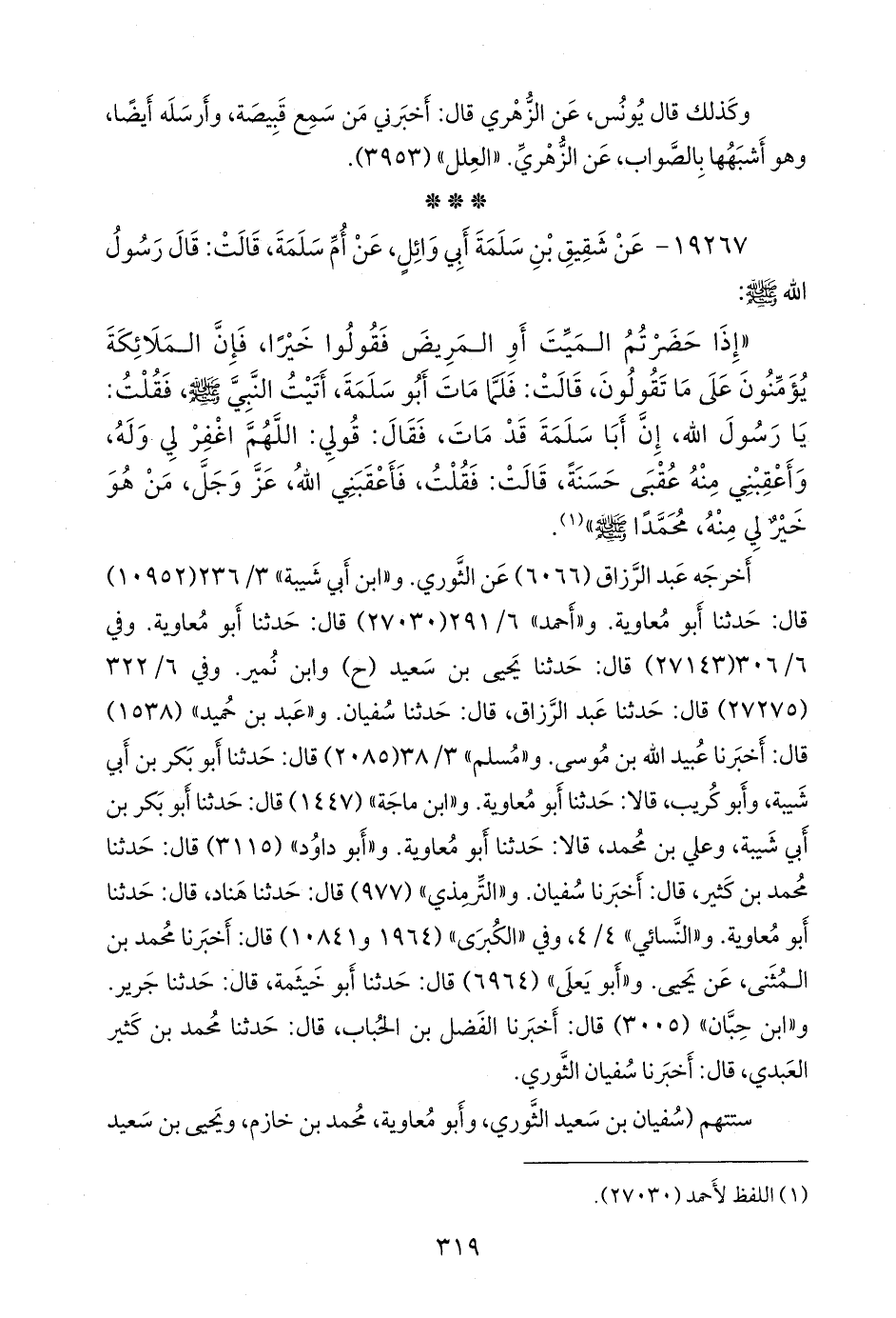 و «أَبو داود» (٣١١٥) قال: حدثنا محمد بن كثير، قال: أخبرنا سفيان. و «التِّرمِذي» (٩٧٧) قال: حدثنا هَنَّاد، قال: حدثنا أَبو معاوية. و «النَّسَائي» ٤/ ٤, وفي «الكبرى» (١٩٦٤ و ١٠٨٤١) قال: أخبرنا محمد بن المثنى, عن يحيى. و «أَبو يَعلى» (٦٩٦٤) قال: حدثنا أَبو خيثمة، قال: حدثنا جَرير. و «ابن حِبَّان» (٣٠٠٥) قال: أخبرنا الفضل بن الحُبَاب، قال: حدثنا محمد بن كثير العبدي، قال: أخبرنا سفيان الثوري.