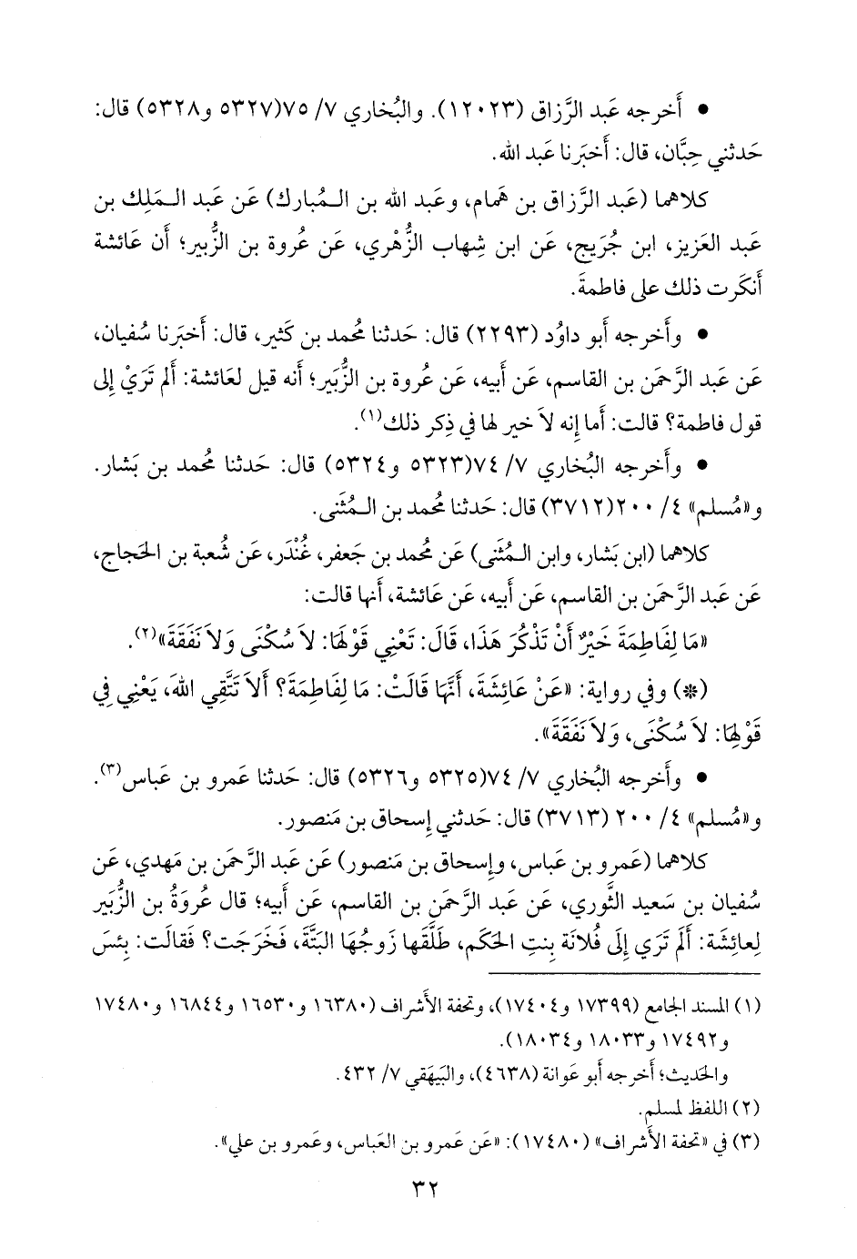 كلاهما (عَمرو بن عباس، وإسحاق بن منصور) عن عبد الرَّحمَن بن مهدي، عن سفيان بن سعيد الثوري، عن عبد الرَّحمَن بن القاسم، عن أبيه؛ قال عروة بن الزبير لعائشة: ألم تري إلى فلانة بنت الحكم، طلقها زوجها البتة، فخرجت؟ فقالت: بئس
