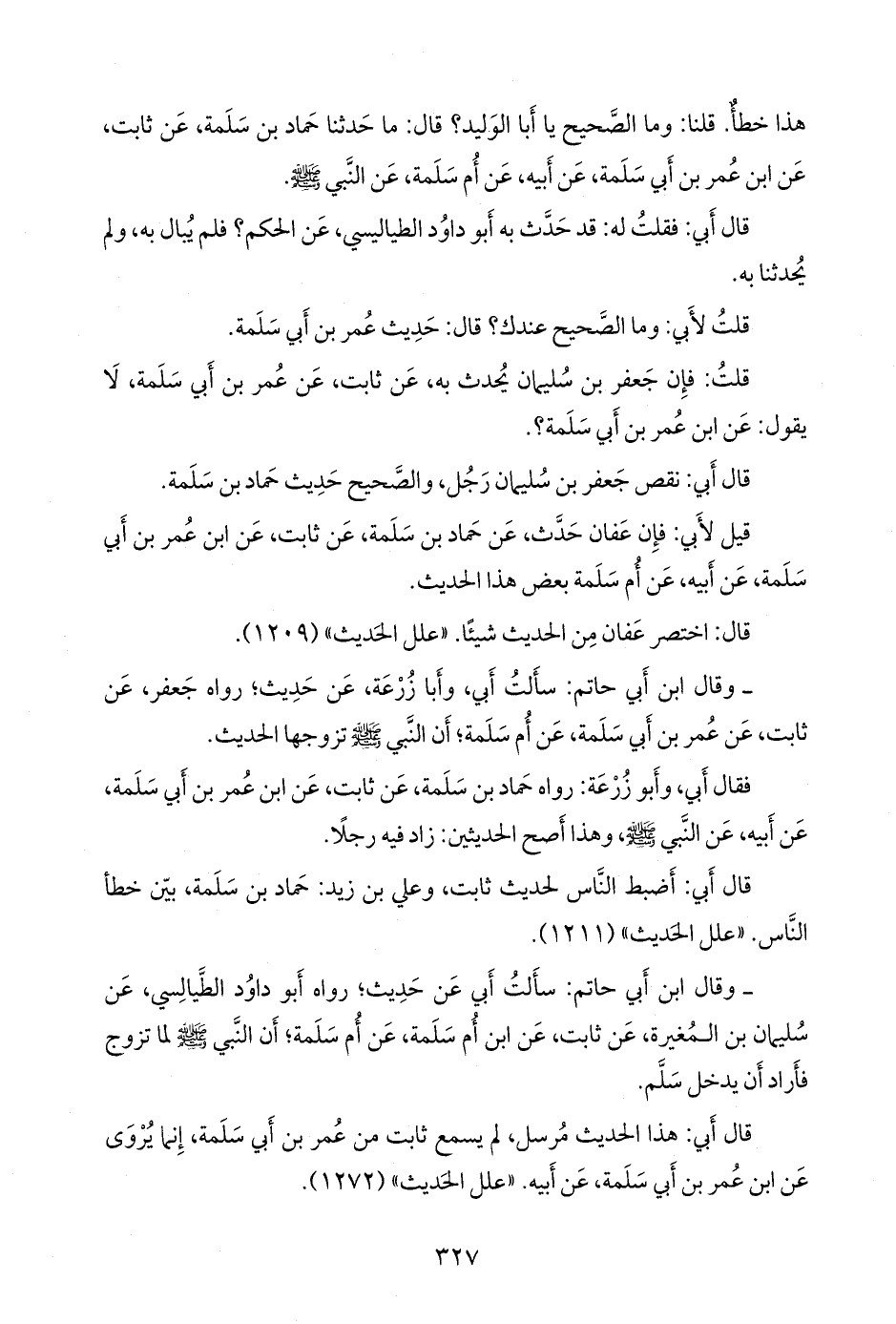 ـ وقال ابن أبي حاتم: سألت أبي، وأَبا زُرعَة، عن حديث؛ رواه جعفر، عن ثابت، عن عمر بن أبي سلمة، عن أُم سلمة؛ أن النبي صَلى الله عَليه وسَلم تزوجها، الحديث.
