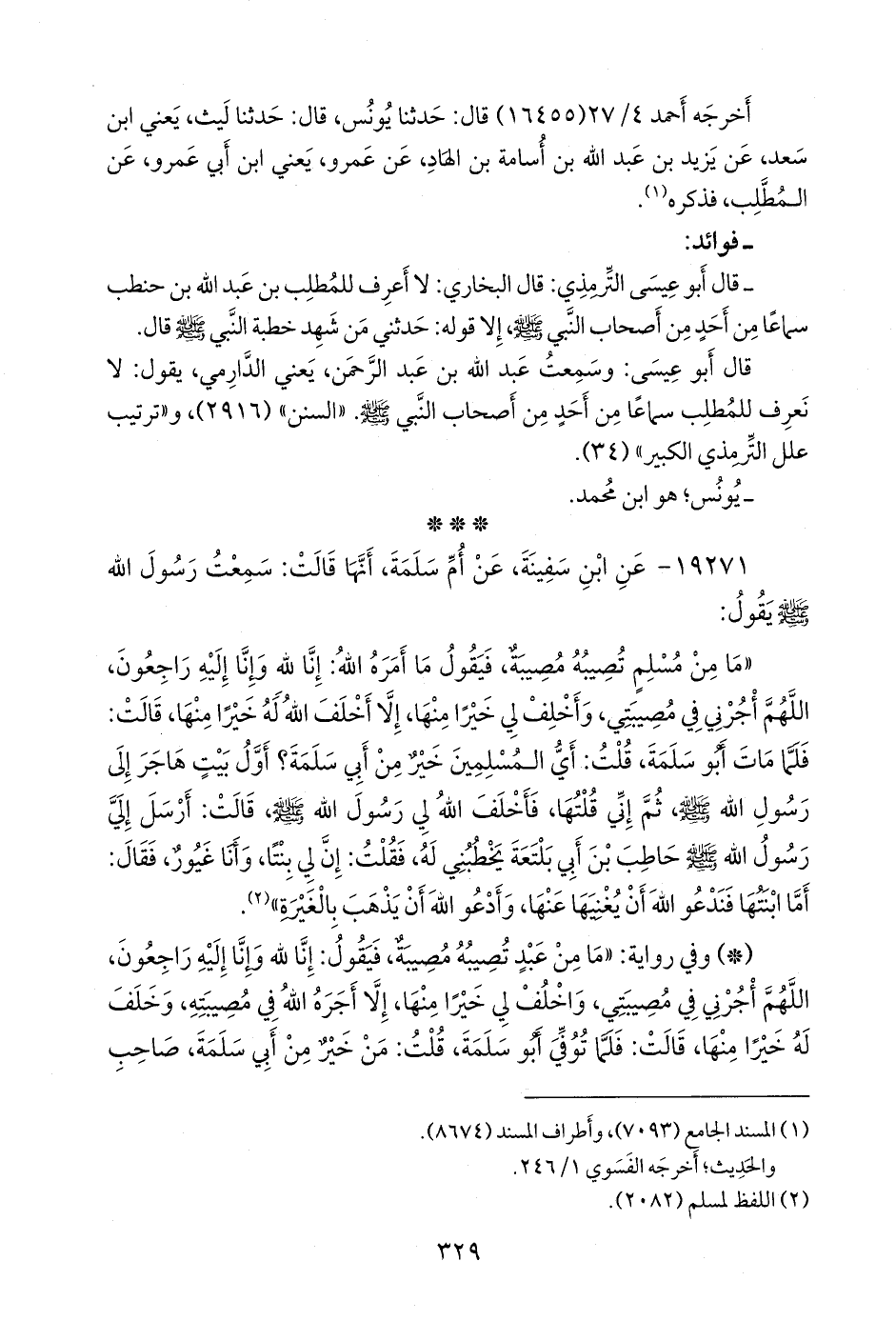 - وفي رواية: «ما من عبد تصيبه مصيبة، فيقول: إنا لله وإنا إليه راجعون، اللهم أجرني في مصيبتي، واخلف لي خيرًا منها، إلا أجره الله في مصيبته، وخلف له خيرًا منها، قالت: فلما توفي أَبو سلمة، قلت: من خير من أبي سلمة، صاحب