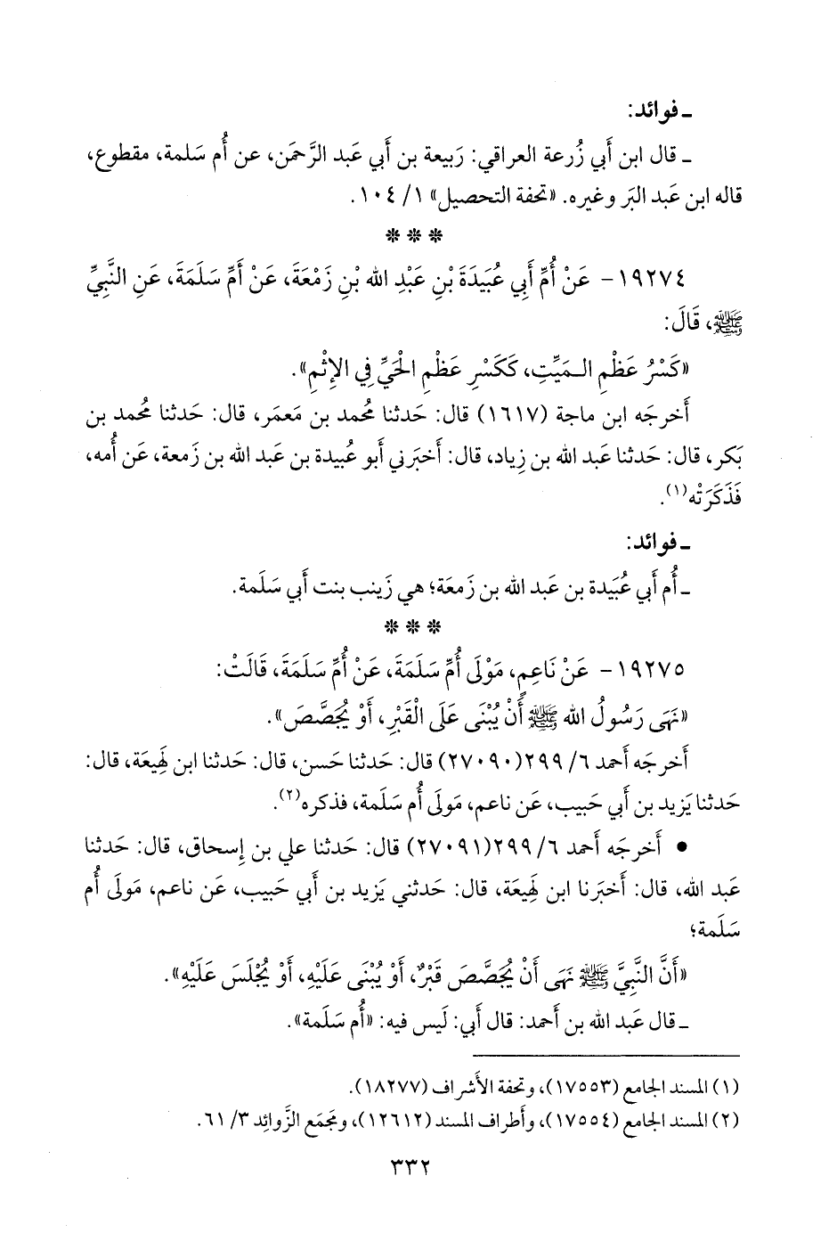 - وقال ابن أَبي زُرعَة العراقي: ربيعة بن أبي عبد الرَّحمَن، عن أُم سلمة، مقطوع، قاله ابن عبد البَر وغيره. «تحفة التحصيل» ١/ ١٠٤.
