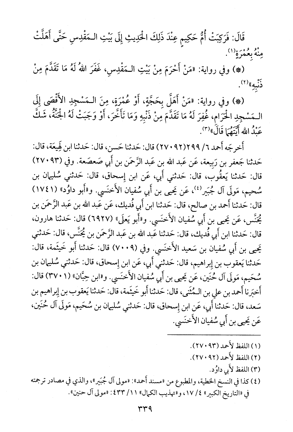 - وفي رواية عبد الله بن عبد الرَّحمَن بن يحنس: «عن يحيى بن أبي سفيان الأخنسي، عن جدته حكيمة».