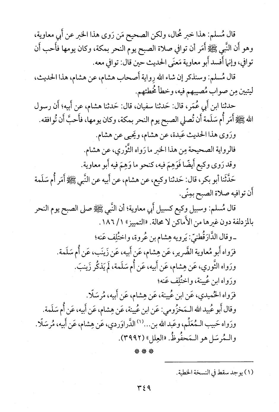 قال مسلم: هذا خبر محال، ولكن الصحيح من روى هذا الخبر عن أبي معاوية، وهو أن النبي صَلى الله عَليه وسَلم أمر أن توافي صلاة الصبح، يوم النحر، بمكة، وكان يومها، فأحب أن توافي، وإنما أفسد أَبو معاوية معنى الحديث حين قال: توافي معه.