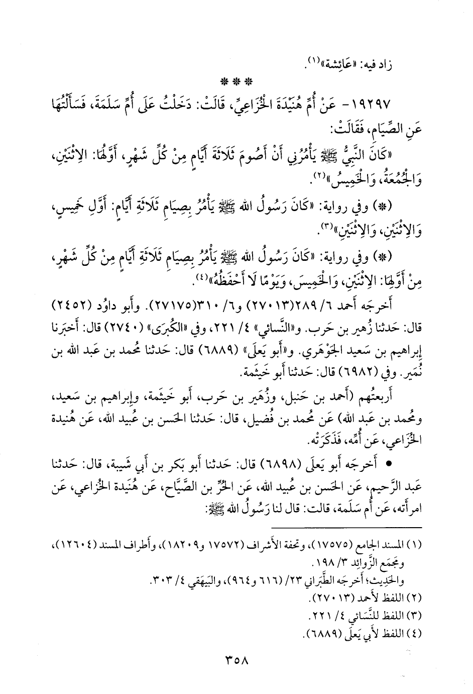 ١٩٢٩٧ - عن أم هنيدة، قالت: دخلت على أُم سلمة، فسألتها عن الصيام، فقالت: