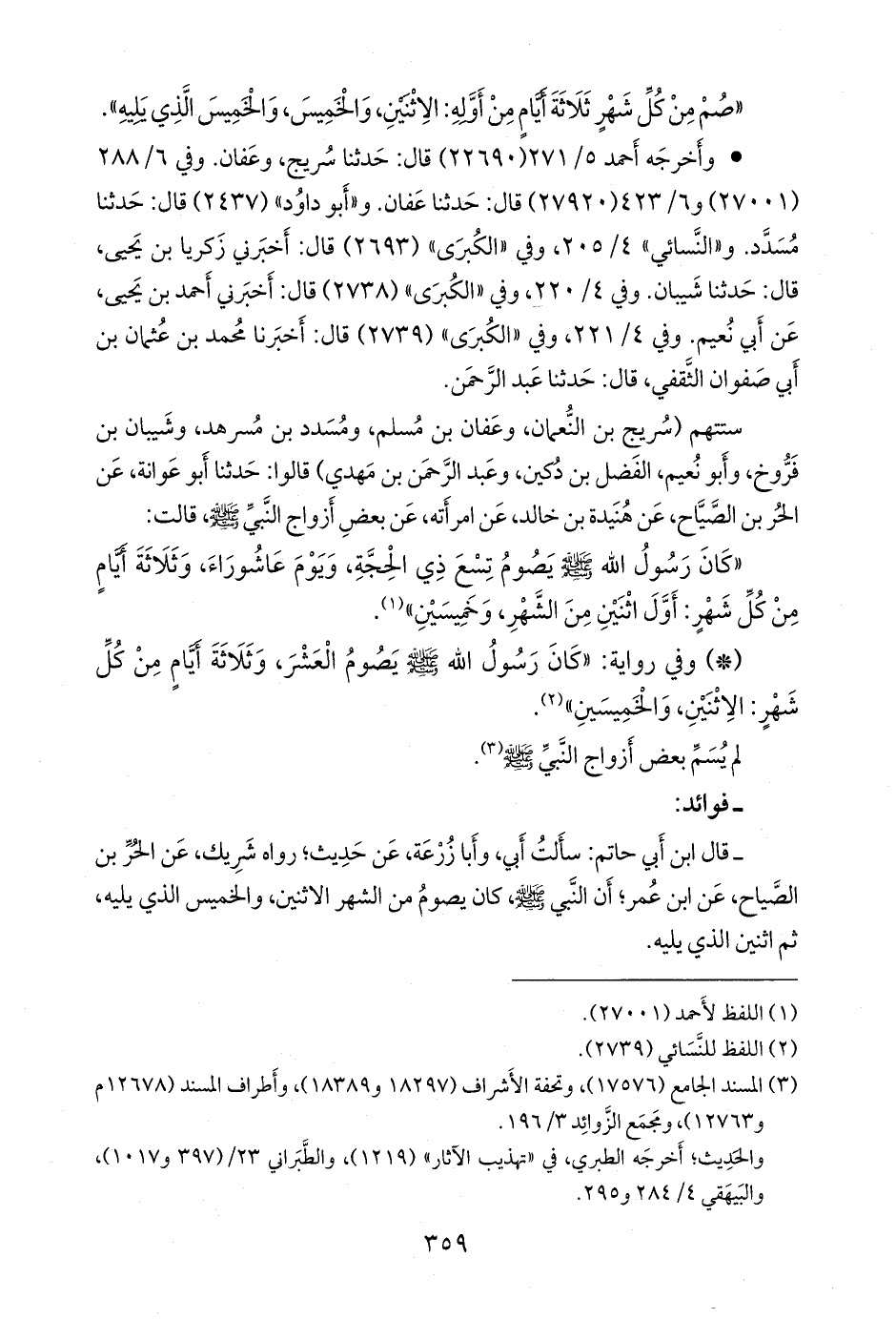 - وفي رواية: «كان رسول الله صَلى الله عَليه وسَلم يصوم العشر، وثلاثة أيام من كل شهر: الاثنين، والخميسين» (¬٢).