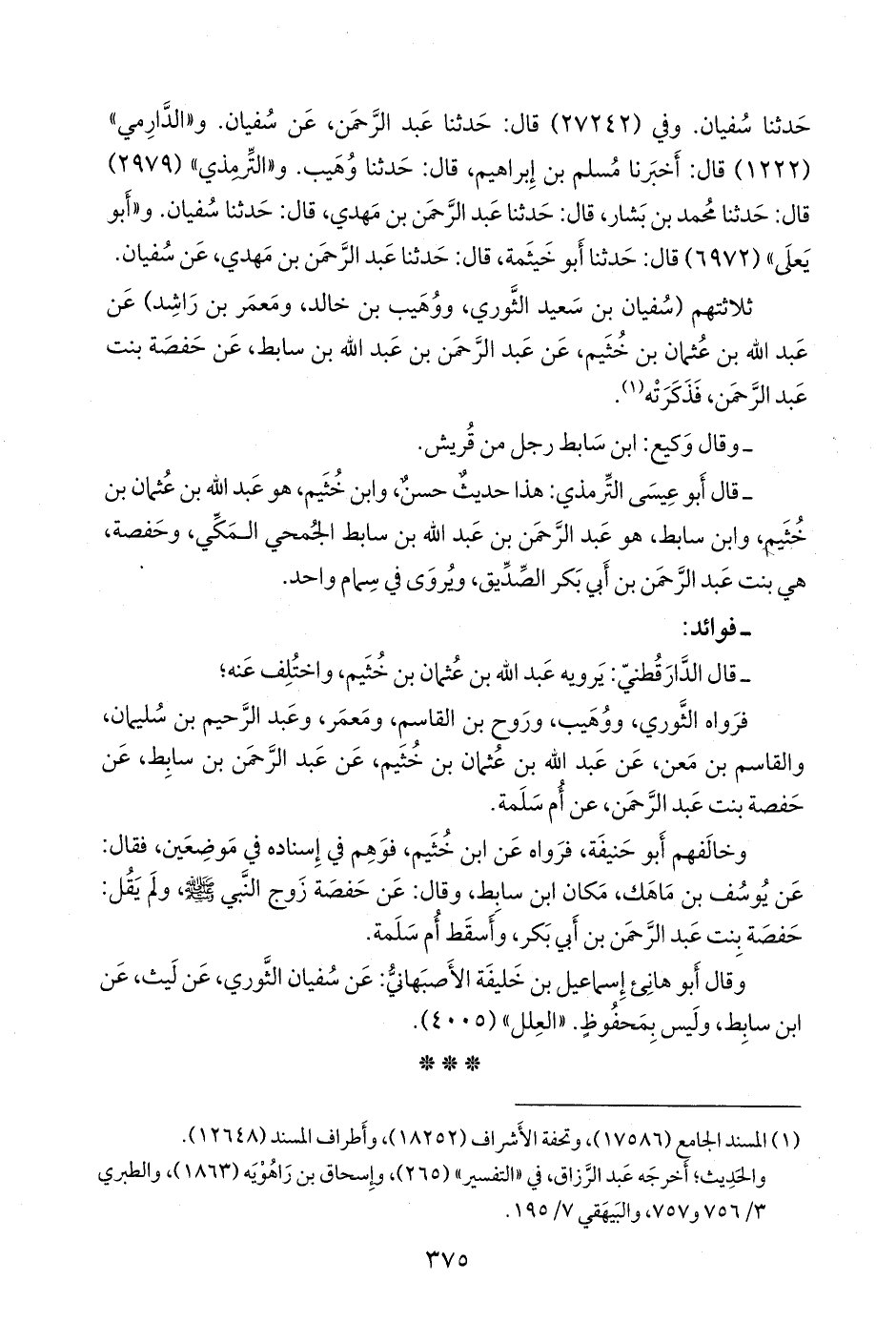 فرواه الثوري، ووهيب، وروح بن القاسم، ومعمر، وعبد الرحيم بن سليمان، والقاسم بن مَعْن، عن عبد الله بن عثمان بن خثيم، عن عبد الرَّحمَن بن سابط، عن حفصة بنت عبد الرَّحمَن، عن أُم سلمة.