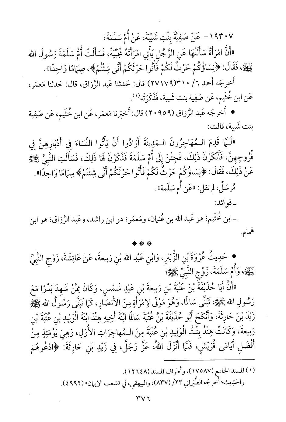«لما قدم المهاجرون المدينة، أرادوا أن يأتوا النساء في أدبارهن، في فروجهن، فأنكرن ذلك، فجئن إلى أُم سلمة، فذكرن لها ذلك، فسألت النبي صَلى الله عَليه وسَلم عن ذلك، فقال: {نساؤكم حرث لكم فأتوا حرثكم أنى شئتم} سماما واحدا».