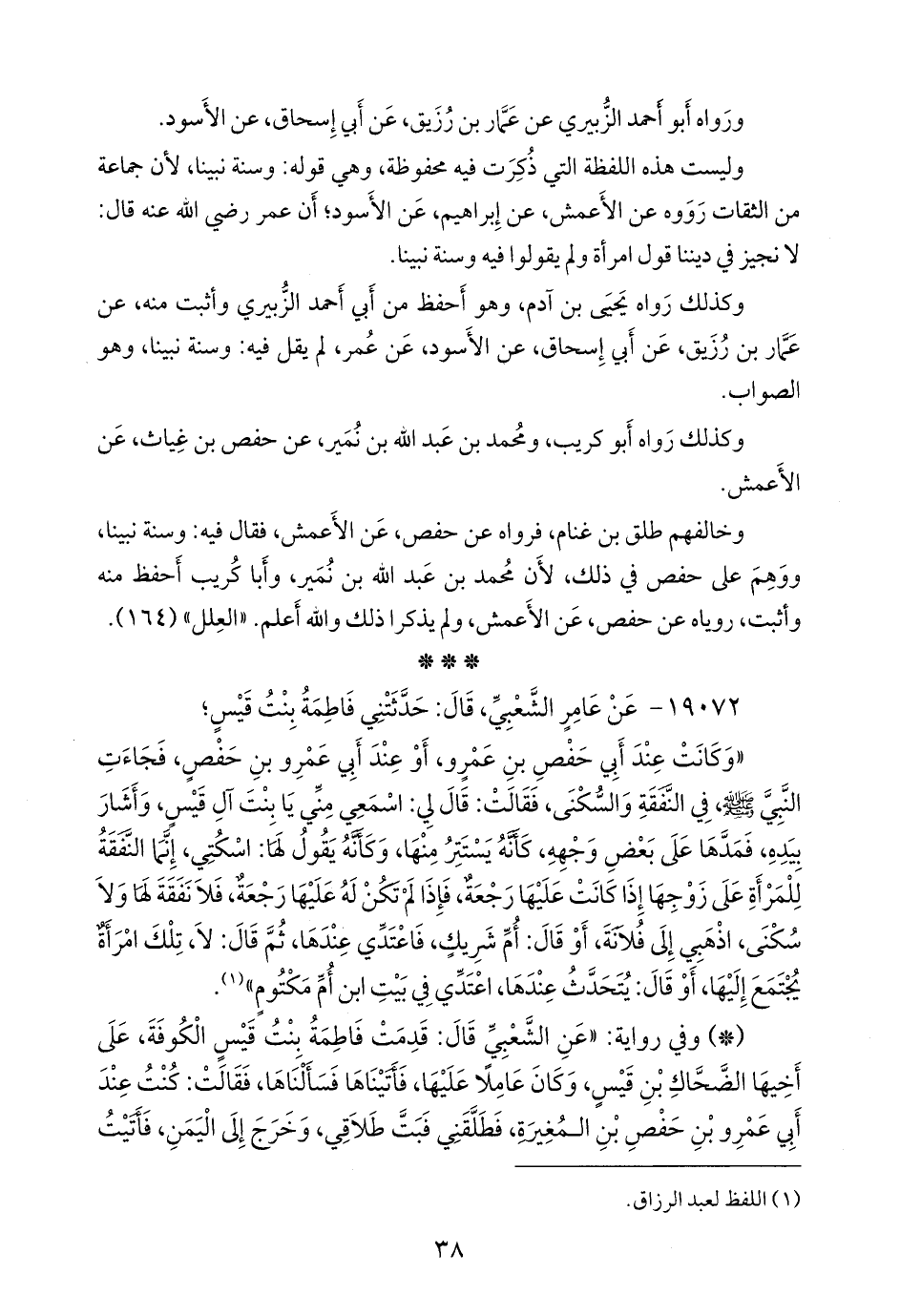 - وفي رواية: «عن الشعبي قال: قدمت فاطمة بنت قيس الكوفة، على أخيها الضحاك بن قيس، وكان عاملا عليها، فأتيناها فسألناها، فقالت: كنت عند أبي عَمرو بن حفص بن المغيرة، فطلقني فبت طلاقي، وخرج إلى اليمن، فأتيت