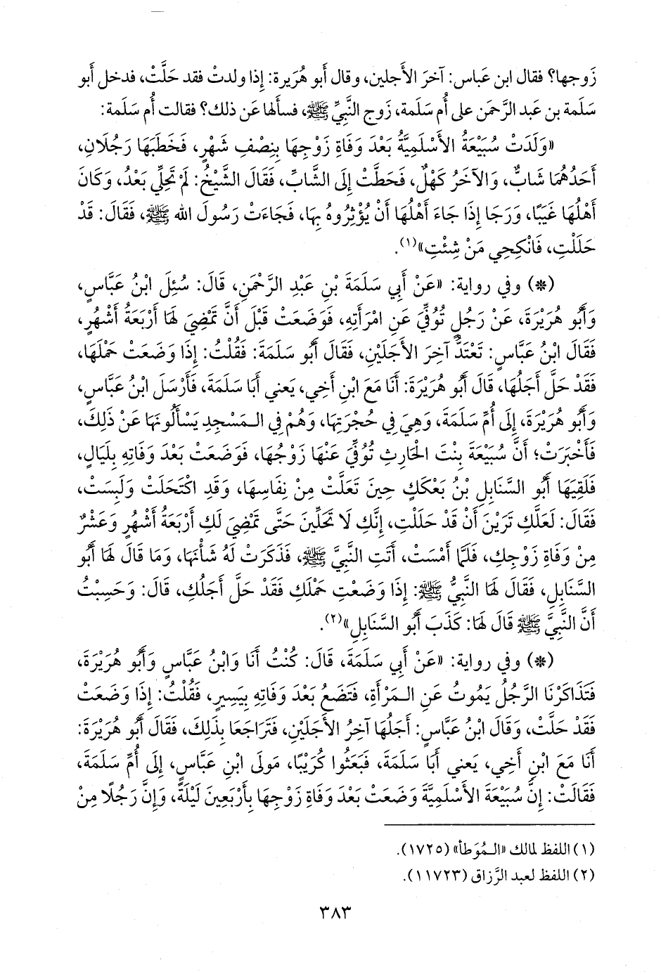 - وفي رواية: «عن أبي سلمة بن عبد الرَّحمَن، قال: سئل ابن عباس، وأَبو هريرة، عن رجل توفي عن امرأته، فوضعت قبل أن تمضي لها أربعة أشهر، فقال ابن عباس: تعتد آخر الأجلين، فقال أَبو سلمة: فقلت: إذا وضعت حملها، فقد حل أجلها، قال أَبو هريرة: أنا مع ابن أخي، يعني أبا سلمة، فأرسل ابن عباس، وأَبو هريرة، إلى أُم سلمة، وهي في حجرتها، وهم في المسجد يسألونها عن ذلك، فأخبرت؛ أن سبيعة بنت الحارث توفي عنها زوجها، فوضعت بعد وفاته بليال، فلقيها أَبو السنابل بن بعكك حين تعلت من نفاسها، وقد اكتحلت ولبست، فقال: لعلك ترين أن قد حللت، إنك لا تحلين حتى تمضي لك أربعة أشهر وعشر من وفاة زوجك، فلما أمست، أتت النبي صَلى الله عَليه وسَلم فذكرت له شأنها، وما قال لها أَبو السنابل، فقال لها النبي صَلى الله عَليه وسَلم: إذا وضعت حملك فقد حل أجلك، قال: وحسبت أن النبي صَلى الله عَليه وسَلم قال لها: كذب أَبو السنابل» (¬١).