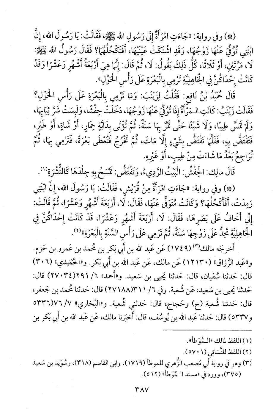 - وفي رواية: «جاءت امرأة من قريش، فقالت: يا رسول الله، إن ابنتي رمدت، أفأكحلها؟ وكانت متوفى عنها، فقال: لا، أربعة أشهر وعشرا، ثم قالت: إني أخاف على بصرها، فقال: لا، أربعة أشهر وعشرا، قد كانت إحداكن في الجاهلية تحد على زوجها سنة، ثم ترمي على رأس السنة بالبعرة» (¬١).
