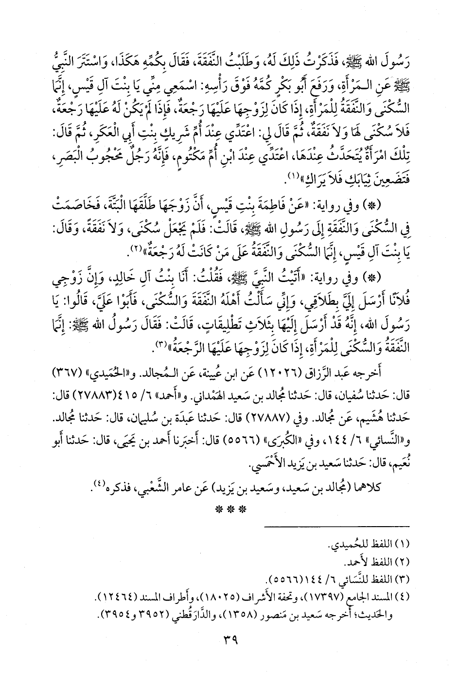 - وفي رواية: «عن الشعبي، قال: حدثتني فاطمة بنت قيس؛ أَن زوجها طلقها البتة، فخاصمته في السكنى والنفقة إِلى رسول الله صَلى الله عَليه وسَلم قالت: فلم يجعل لي سكنى، ولا نفقة، وقال: يا بنت آل قيس، إِنما السكنى والنفقة على من كانت له رجعة».