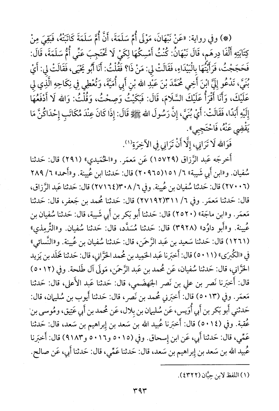 أخرجه عبد الرزاق (١٥٧٢٩) عن مَعمَر. و «الحميدي» (٢٩١) قال: حدثنا سفيان. و «ابن أبي شيبة» (٢٠٩٦٥) قال: حدثنا ابن عُيينة. و «أحمد» ٦/ ٢٨٩ (٢٧٠٠٦) قال: حدثنا سفيان بن عُيينة. وفي ٦/ ٣٠٨ (٢٧١٦٤) قال: حدثنا عبد الرزاق، قال: حدثنا مَعمَر. وفي ٦/ ٣١١ (٢٧١٩٢) قال: حدثنا محمد بن جعفر، قال: حدثنا معمر. و «ابن ماجة» (٢٥٢٠) قال: حدثنا أَبو بكر بن أبي شيبة، قال: حدثنا سفيان بن عُيينة. و «أَبو داود» (٣٩٢٨) قال: حدثنا مُسدد، قال: حدثنا سفيان. و «التِّرمِذي» (١٢٦١) قال: حدثنا سعيد بن عبد الرَّحمَن، قال: حدثنا سفيان بن عُيينة. و «النَّسَائي» في «الكبرى» (٥٠١١) قال: أخبرنا عبد الحميد بن محمد الحراني، قال: حدثنا مخلد بن يزيد الحراني، قال: حدثنا سفيان، عن محمد بن عبد الرَّحمَن مولى آل طلحة. وفي (٥٠١٢) قال: أخبرنا نصر بن علي بن نصر الجهضمي, قال: حدثنا عبد الأعلى، قال: حدثنا معمر. وفي (٥٠١٣) قال: أخبرني محمد بن نصر، قال: حدثنا أيوب بن سليمان، قال: حدثني أَبو بكر بن أبي أويس، عن سليمان بن بلال، عن محمد بن أبي عتيق، وموسى بن عُقبة. وفي (٥٠١٤) قال: أخبرنا عُبيد الله بن سعد بن إبراهيم بن سعد، قال: حدثنا عمي, قال: حدثنا أبي، عن ابن إسحاق. وفي (٥٠١٥ و ٥٠١٦ و ٩١٨٣) قال: أخبرنا عُبيد الله بن سعد بن إبراهيم بن سعد، قال: حدثنا عمي، قال: حدثنا أبي، عن صالح.