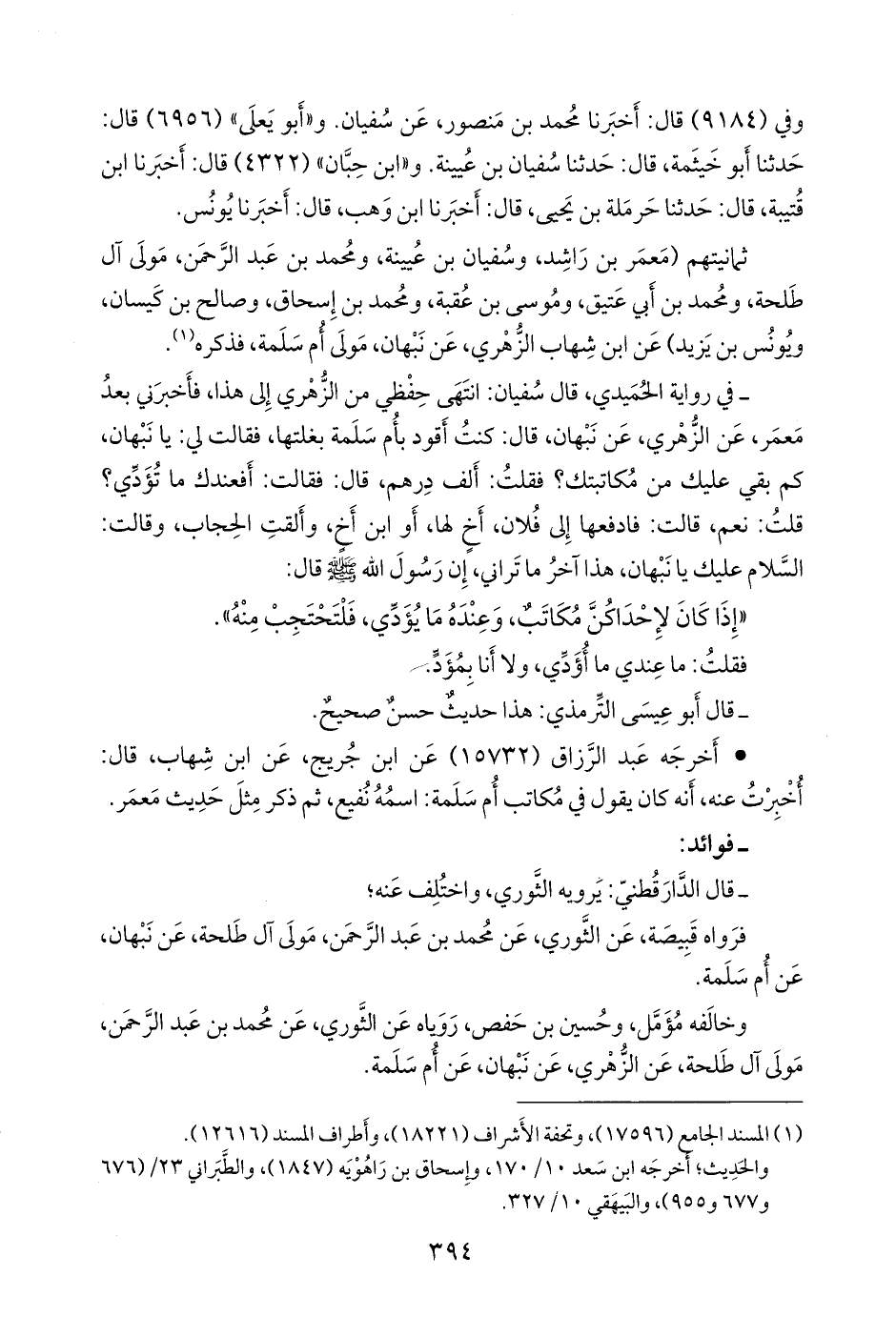 - في رواية الحميدي، قال سفيان: انتهى حفظي من الزُّهْري إلى هذا، فأخبرني بعد مَعمَر، عن الزُّهْري، عن نبهان، قال: كنت أقود بأُم سلمة بغلتها، فقالت لي: يا نبهان، كم بقي عليك من مكاتبتك؟ فقلت: ألف درهم، قال: فقالت: أفعندك ما تؤدي؟ قلت: نعم، قالت: فادفعها إلى فلان، أخ لها، أو ابن أخ، وألقت الحجاب، وقالت: السلام عليك يا نبهان، هذا آخر ما تراني، إن رسول الله صَلى الله عَليه وسَلم قال: