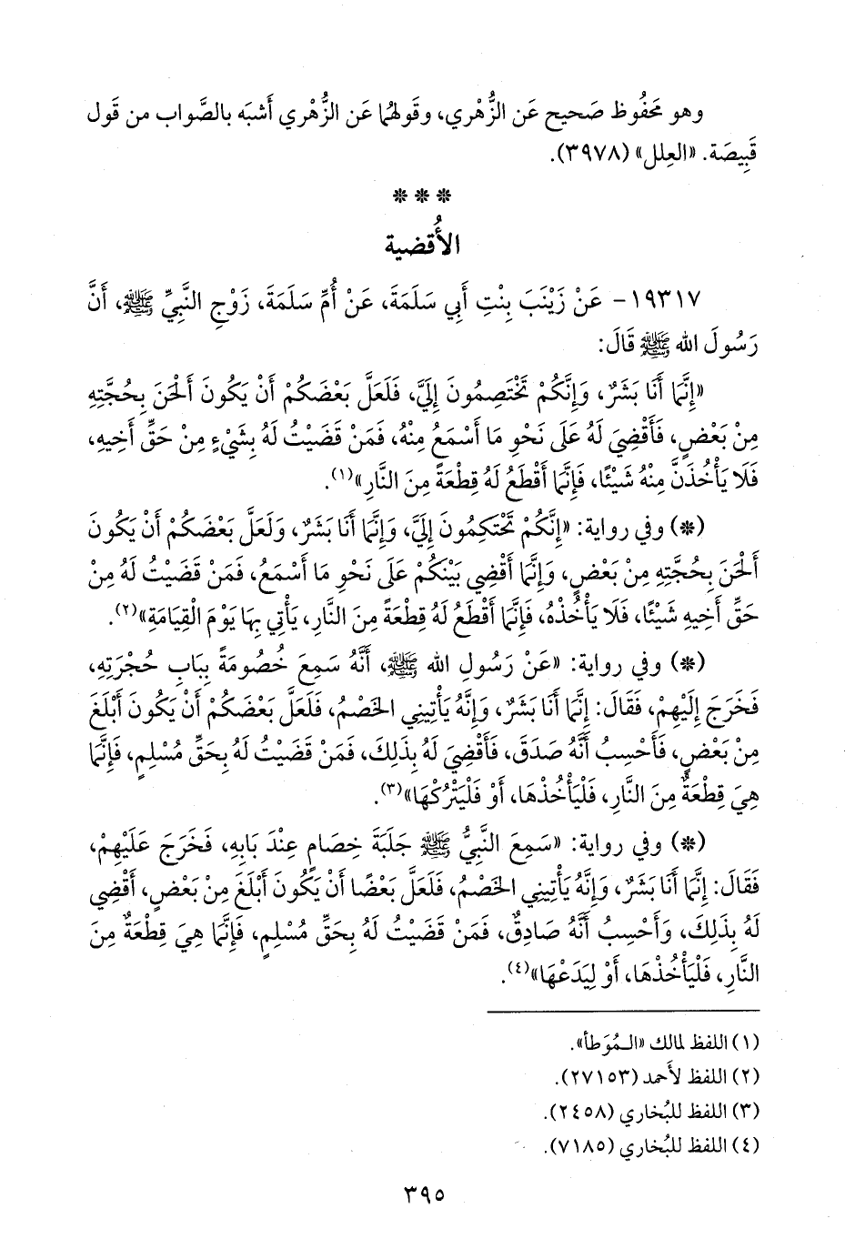- وفي رواية: «عن رسول الله صَلى الله عَليه وسَلم أنه سمع خصومة بباب حجرته، فخرج إليهم، فقال: إنما أنا بشر، وإنه يأتيني الخصم، فلعل بعضكم أن يكون أبلغ من بعض، فأحسب أنه صدق، فأقضي له بذلك، فمن قضيت له بحق مسلم، فإنما هي قطعة من النار، فليأخذها، أو فليتركها» (¬٣).
