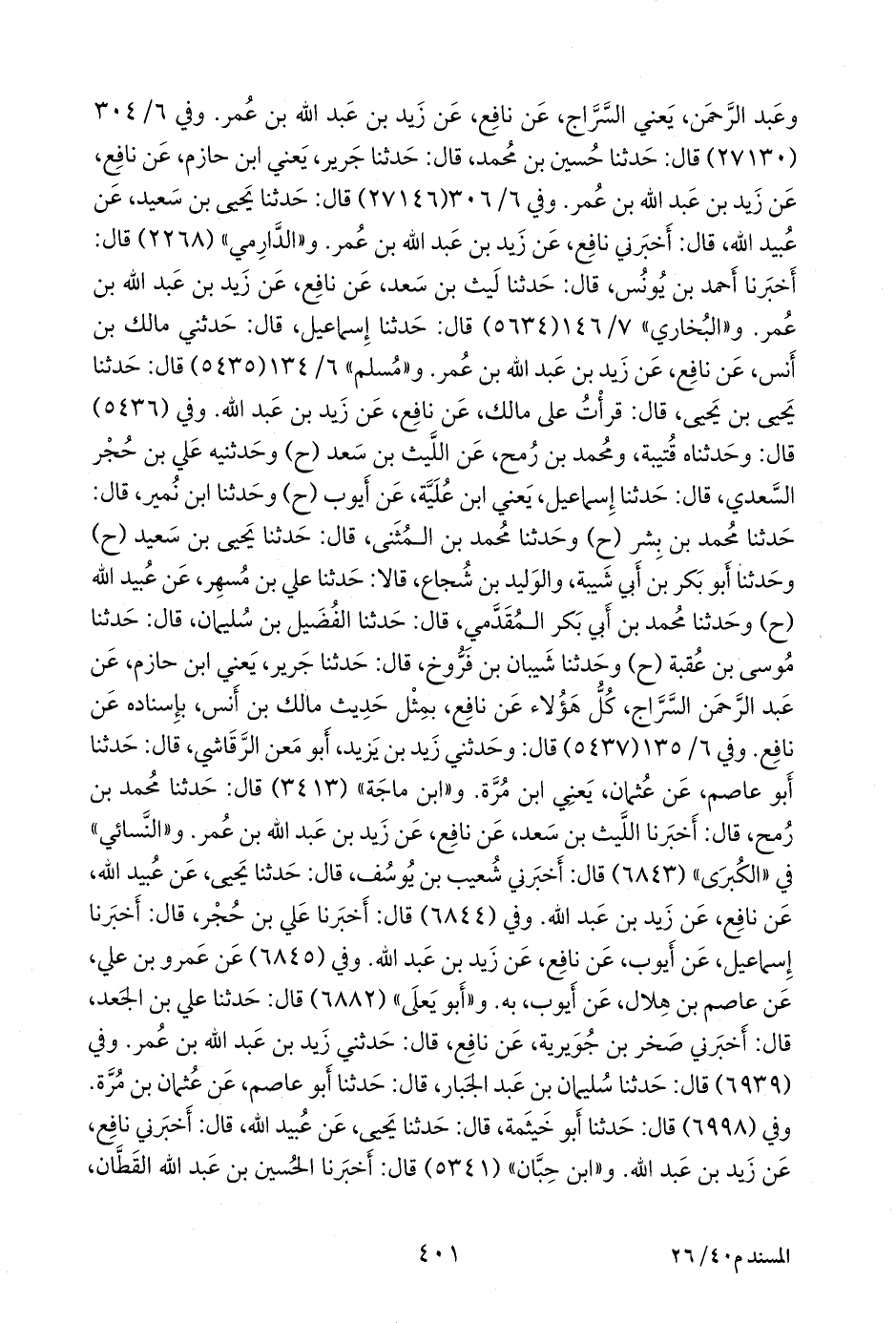 و «البخاري» ٧/ ١٤٦ (٥٦٣٤) قال: حدثنا إسماعيل، قال: حدثني مالك بن أنس، عن نافع، عن زيد بن عبد الله بن عمر. و «مسلم» ٦/ ١٣٤ (٥٤٣٥) قال: حدثنا يحيى بن يحيى، قال: قرأت على مالك، عن نافع، عن زيد بن عبد الله. وفي (٥٤٣٦) قال: وحدثناه قتيبة، ومحمد بن رُمح، عن الليث بن سعد (ح) وحدثنيه علي بن حُجْر السعدي، قال: حدثنا إسماعيل، يعني ابن عُلَية، عن أيوب (ح) وحدثنا ابن نُمير، قال: حدثنا محمد بن بشر (ح) وحدثنا محمد بن المثنى، قال: حدثنا يحيى بن سعيد (ح) وحدثنا أَبو بكر بن أبي شيبة، والوليد بن شجاع، قالا: حدثنا علي بن مُسهِر، عن عُبيد الله (ح) وحدثنا محمد بن أَبي بكر المُقَدَّمي، قال: حدثنا الفضيل بن سليمان، قال: حدثنا موسى بن عُقبة (ح) وحدثنا شَيبان بن فَرُّوخ، قال: حدثنا جرير، يعني ابن حازم، عن عبد الرَّحمَن السراج، كل هؤلاء عن نافع، بمثل حديث مالك بن أنس، بإسناده عن نافع. وفي ٦/ ١٣٥ (٥٤٣٧) قال: وحدثني زيد بن يزيد، أَبو معن الرَّقَاشي، قال: حدثنا أَبو عاصم، عن عثمان، يعني ابن مُرَّة. و «ابن ماجة» (٣٤١٣) قال: حدثنا محمد بن رُمح، قال: أخبرنا الليث بن سعد، عن نافع، عن زيد بن عبد الله بن عمر. و «النَّسَائي» في «الكبرى» (٦٨٤٣) قال: أخبرني شعيب بن يوسف، قال: حدثنا يحيى، عن عُبيد الله، عن نافع، عن زيد بن عبد الله. وفي (٦٨٤٤) قال: أخبرنا علي بن حُجْر، قال: أخبرنا إسماعيل، عن أيوب، عن نافع، عن زيد بن عبد الله. وفي (٦٨٤٥) عن عَمرو بن علي، عن عاصم بن هلال، عن أيوب، به. و «أَبو يَعلى» (٦٨٨٢) قال: حدثنا علي بن الجعد، قال: أخبرني صخر بن جويرية، عن نافع، قال: حدثني زيد بن عبد الله بن عمر. وفي (٦٩٣٩) قال: حدثنا سليمان بن عبد الجبار، قال: حدثنا أَبو عاصم، عن عثمان بن مُرَّة. وفي (٦٩٩٨) قال: حدثنا أَبو خيثمة، قال: حدثنا يحيى، عن عُبيد الله، قال: أخبرني نافع، عن زيد بن عبد الله. و «ابن حِبَّان» (٥٣٤١) قال: أخبرنا الحسين بن عبد الله القطان،