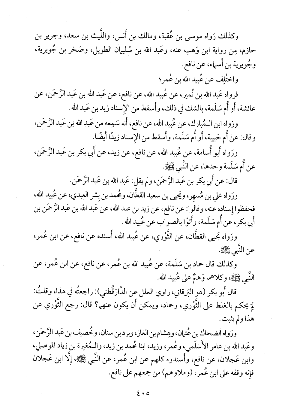 ورواه الضحاك بن عثمان، وهشام بن الغاز، وبرد بن سنان، وخصيف بن عبد الرَّحمَن، وعبد الله بن عامر الأسلمي، وعمر وزيد، ابنا محمد بن زيد، والمغيرة بن زياد الموصلي، وابن عجلان، عن نافع، وأسندوه كلهم عن ابن عمر، عن النبي صَلى الله عَليه وسَلم إلا ابن عجلان فإنه وقفه على ابن عمر، (وملاوهم) من جمعهم على نافع.