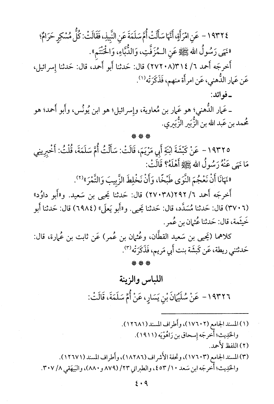 ١٩٣٢٥ - عن كبشة ابنة أبي مريم، قالت: سألت أُم سلمة، قلت: أخبريني ما نهى عنه رسول الله صَلى الله عَليه وسَلم أهله؟ قالت:
