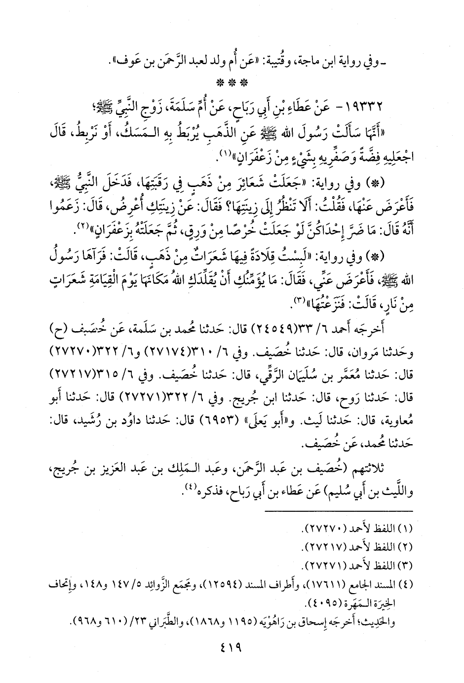 - وفي رواية: «عن أُم سلمة، زوج النبي صَلى الله عَليه وسَلم قالت: جعلت شعائر من ذهب في رقبتها، فدخل النبي صَلى الله عَليه وسَلم فأعرض عنها، فقلت: ألا تنظر إلى زينتها؟ فقال: عن زينتك أعرض.