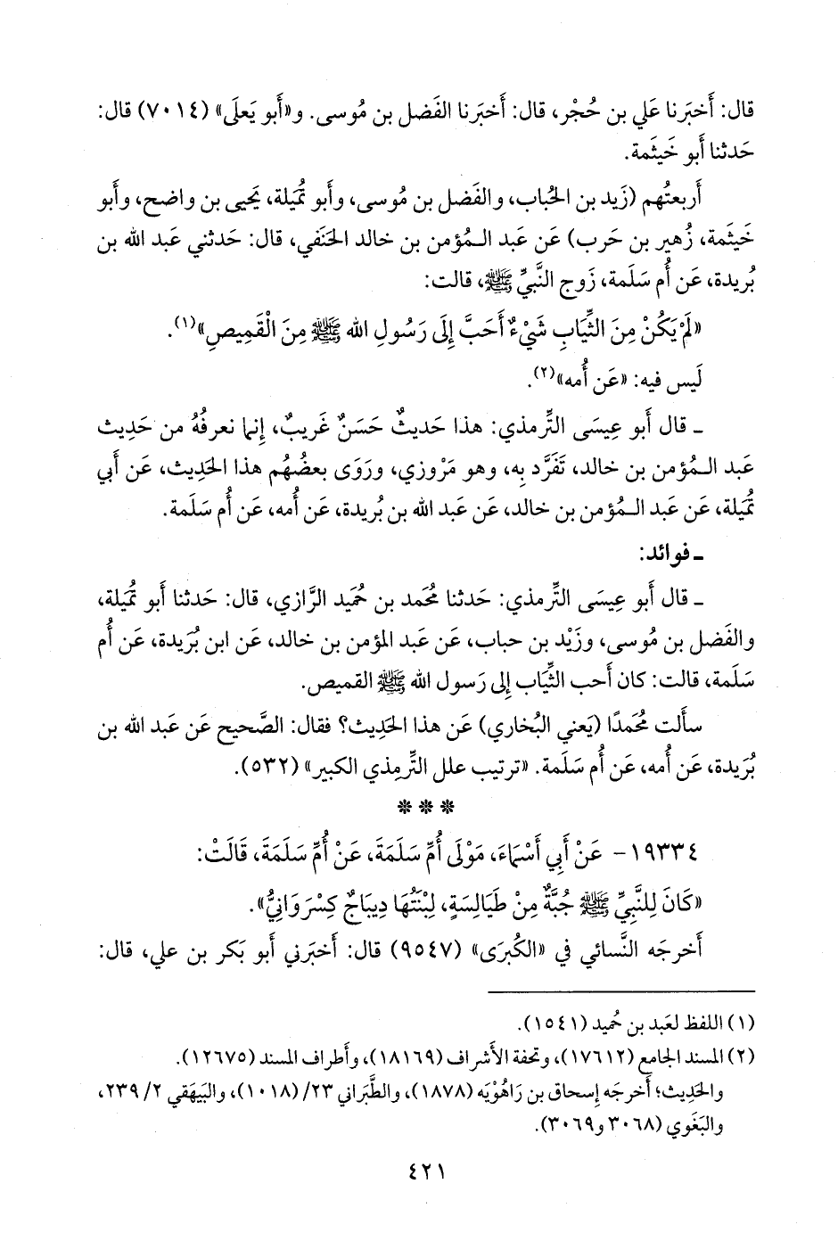 - قال التِّرمِذي: حدثنا محمد بن حميد الرازي، قال: حدثنا أَبو تميلة، والفضل بن موسى، وزيد بن حباب، عن عبد المؤمن بن خالد، عن ابن بُرَيدة، عن أُم سلمة، قالت: كان أحب الثياب إلى رسول الله صَلى الله عَليه وسَلم القميص.